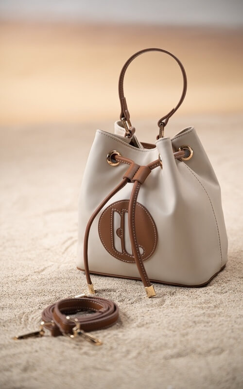 4. Tas Bucket Cream dengan Detail Tali Serut