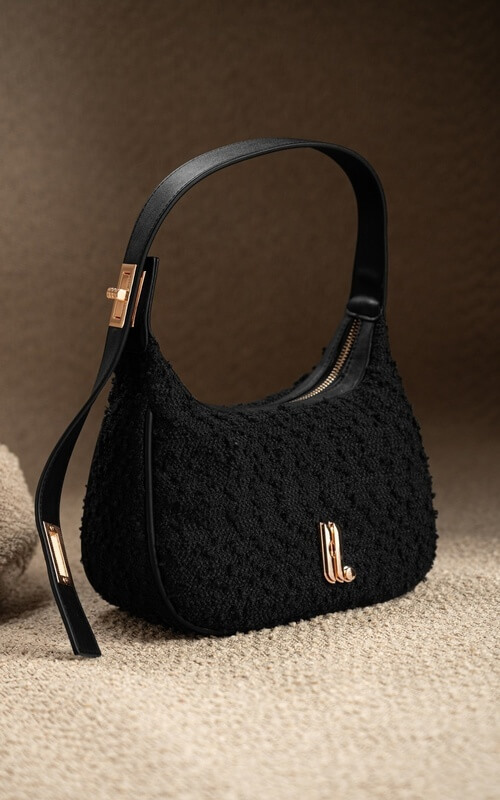 Handbag berbentuk tas shoulder ini memancarkan kesan elegan dan modern dengan material rajut hitam yang unik. Tekstur rajut yang tebal memberikan dimensi dan karakter tersendiri pada tas ini, sementara tali bahu yang ramping memberikan kenyamanan saat dikenakan.