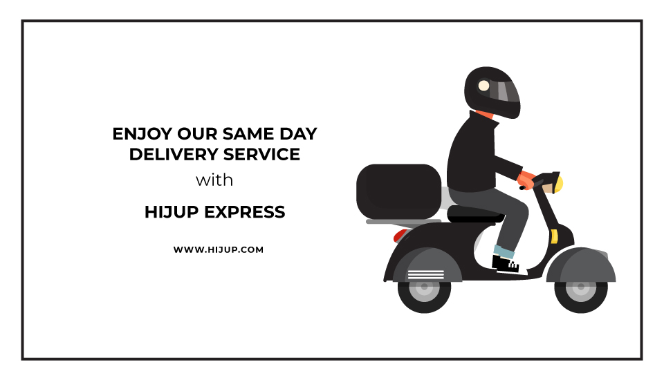 HIJUP kembali mengembangkan sistem pengiriman yang akan memuaskan para customers. HIJUP mengadirkan HIJUP Express yang merupakan pelayanan shop now and have it now. Berbeda dengan sistem COD yang memerlukan estimasi waktu pengiriman 1 – 2 hari setelah pemesanan, HIJUP Express akan dikirim langsung setelah kamu selesai memesan di hari yang sama.