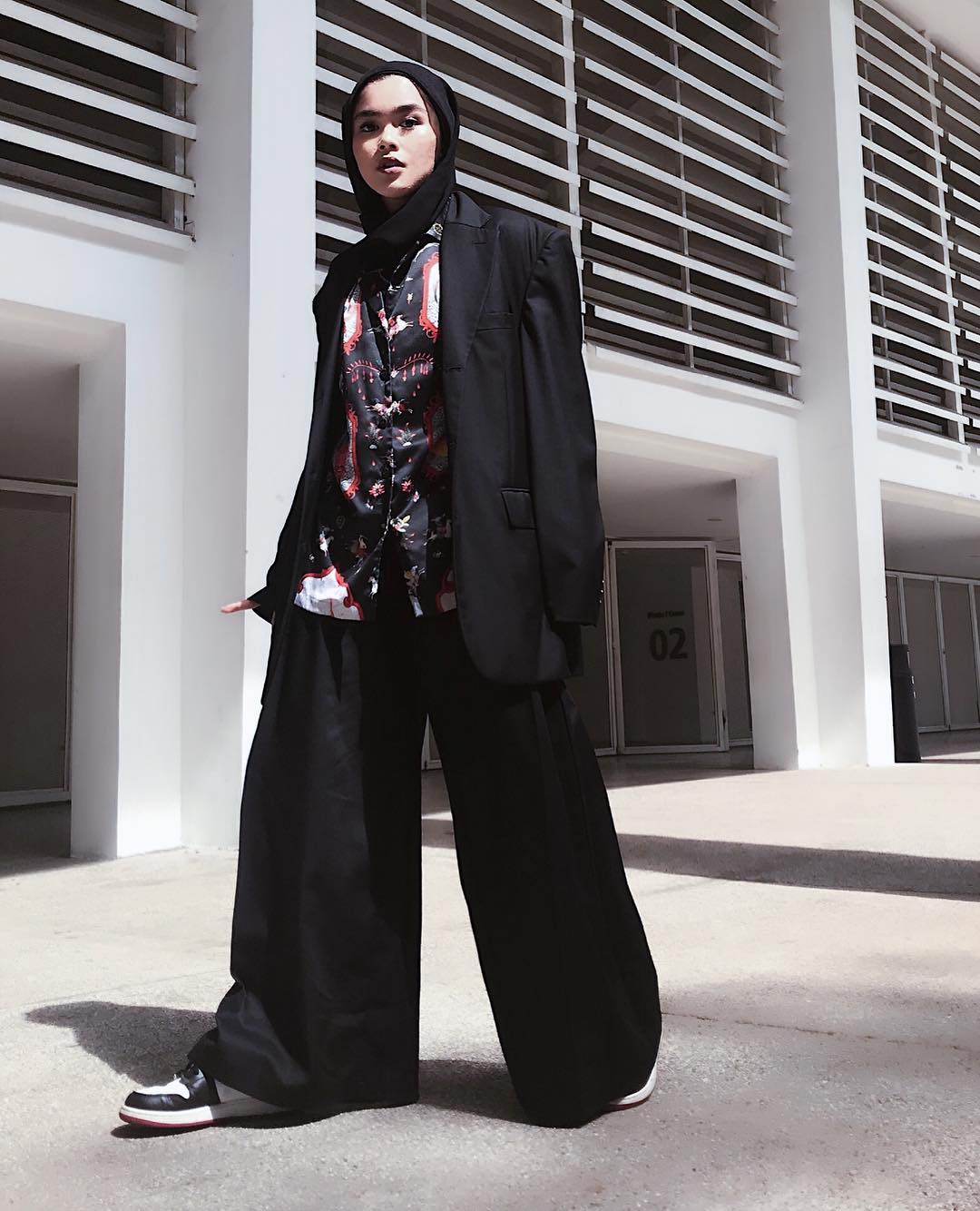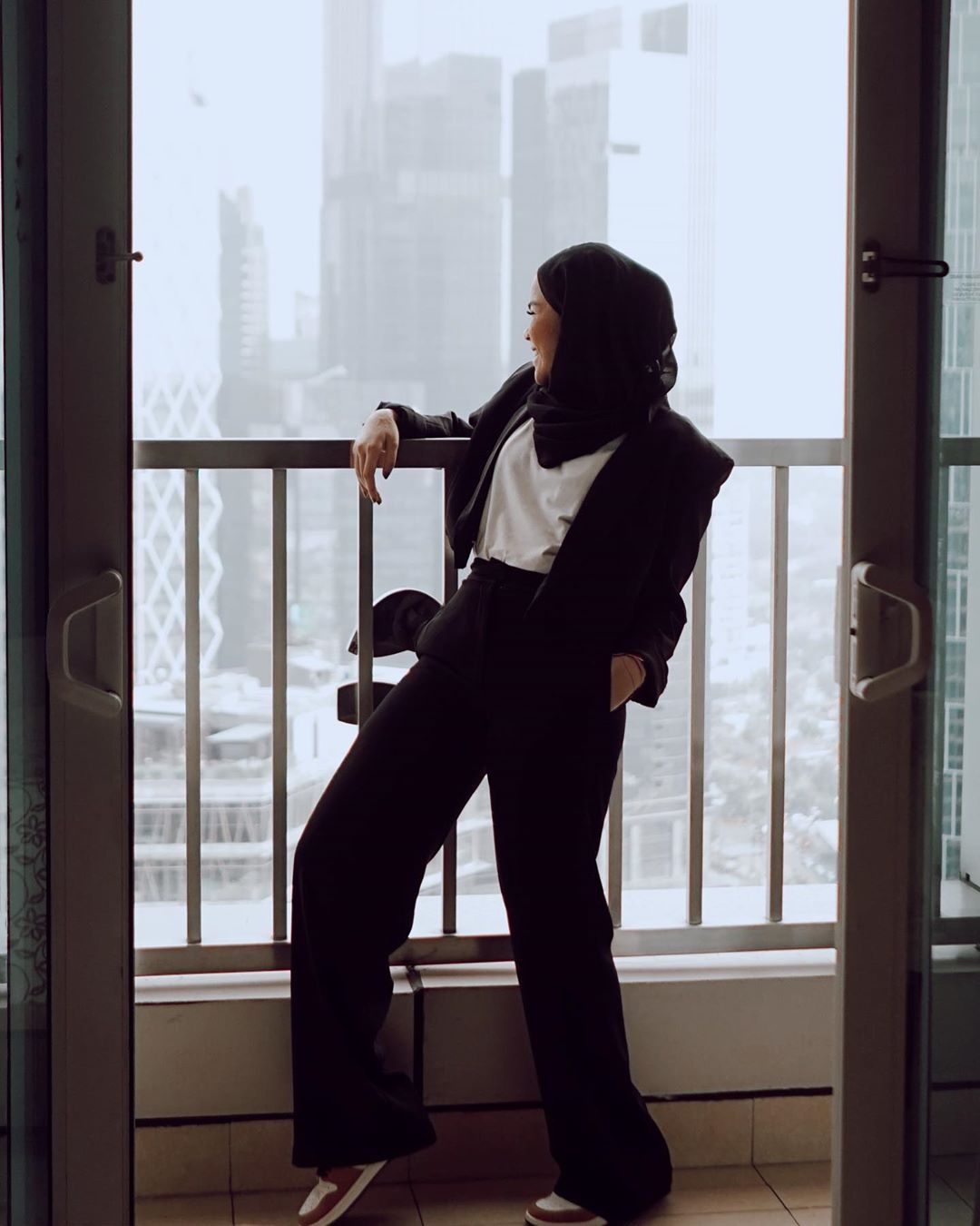 Monokrom outfit memang menjadi outfit andalan bagi semua orang tak kerkecuali hijabers. Warna ini masih jadi pilihan hijabers untuk membuat gaya menjadi effortlessly chic. Tampilan keseluruhan Sivia terlihat semakin stylish dengan hijab warna hitam dipadukan dengan outer dan celana palazzo berwarna hitam dan kaus putih polos. Sivia menambahkan sneakers berwarna kontras yakni putih merah untuk meng-highlight penampilannya.