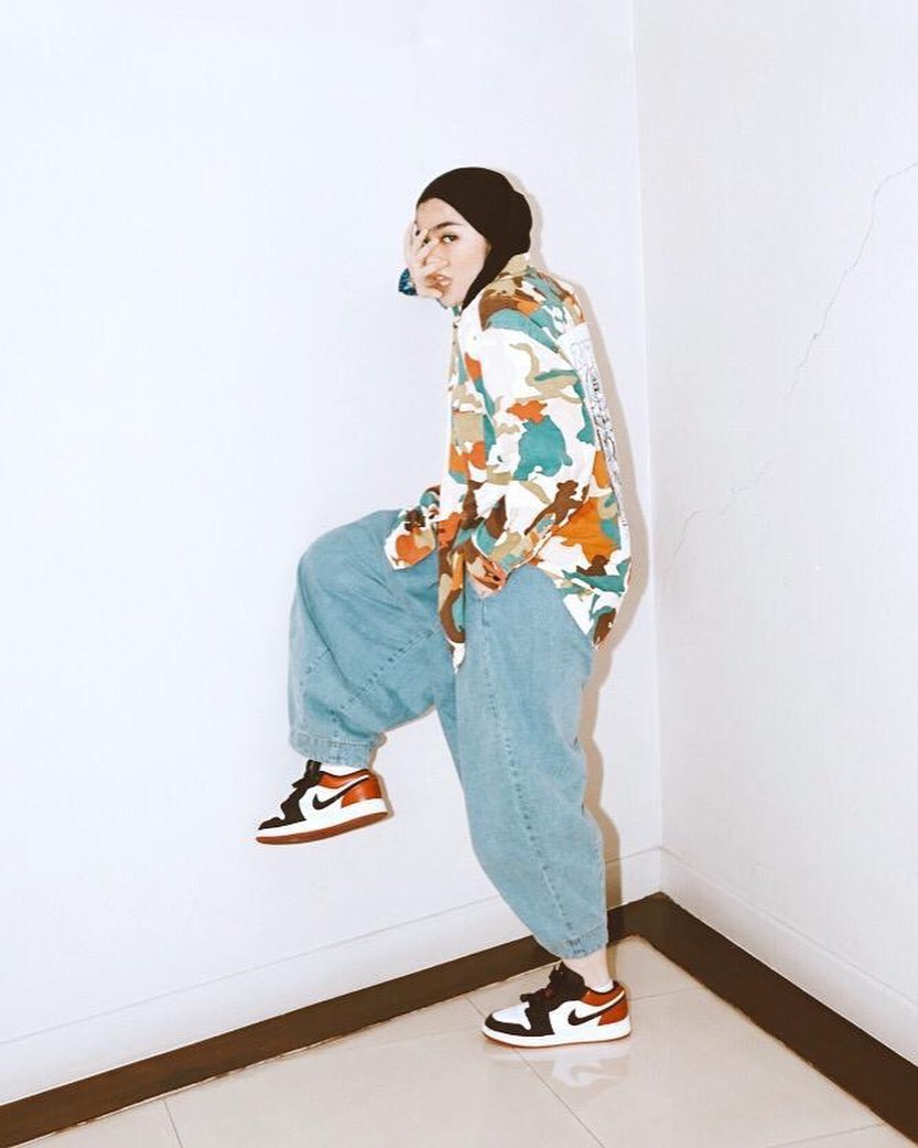 Siapa bilang saat mengenakan playful fashion item kamu tidak bisa mendapatkan gaya yang sporty? Kamu juga bisa mendapatkan gaya yang sporty dengan menggunakan playful outer seperti yang Sivia kenakan. Sivia memadukan playful outer perpaduan dengan celana jeans oversized yang dapat menghasilkan gaya sporty. Agar tidak tampil berlebihan Sivia memadukan dengan hijab polos berwarna hitam. Tambahkan sneakers andalan yang senada dengan keseluruhan outfit kamu.