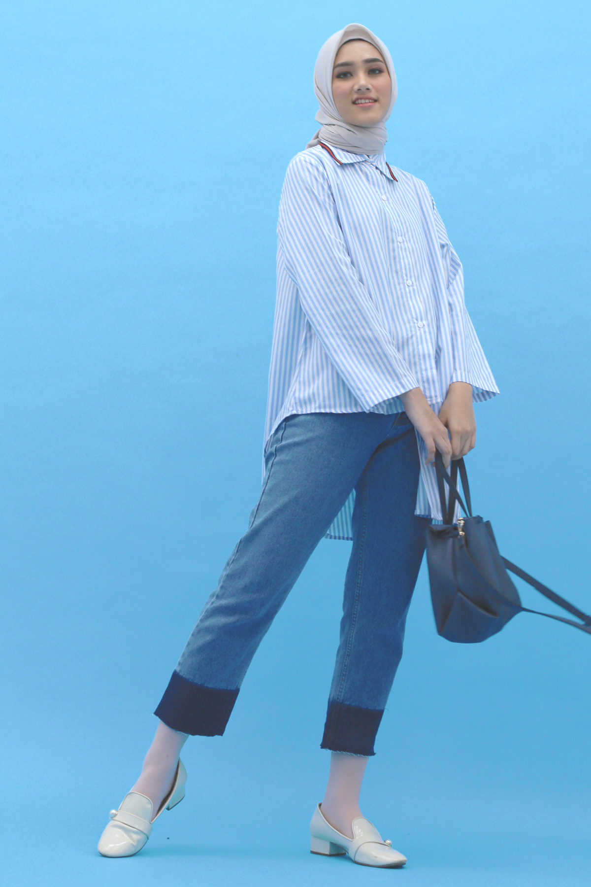 1. Tampil simpel dan gaya kombinasi kemeja garis.