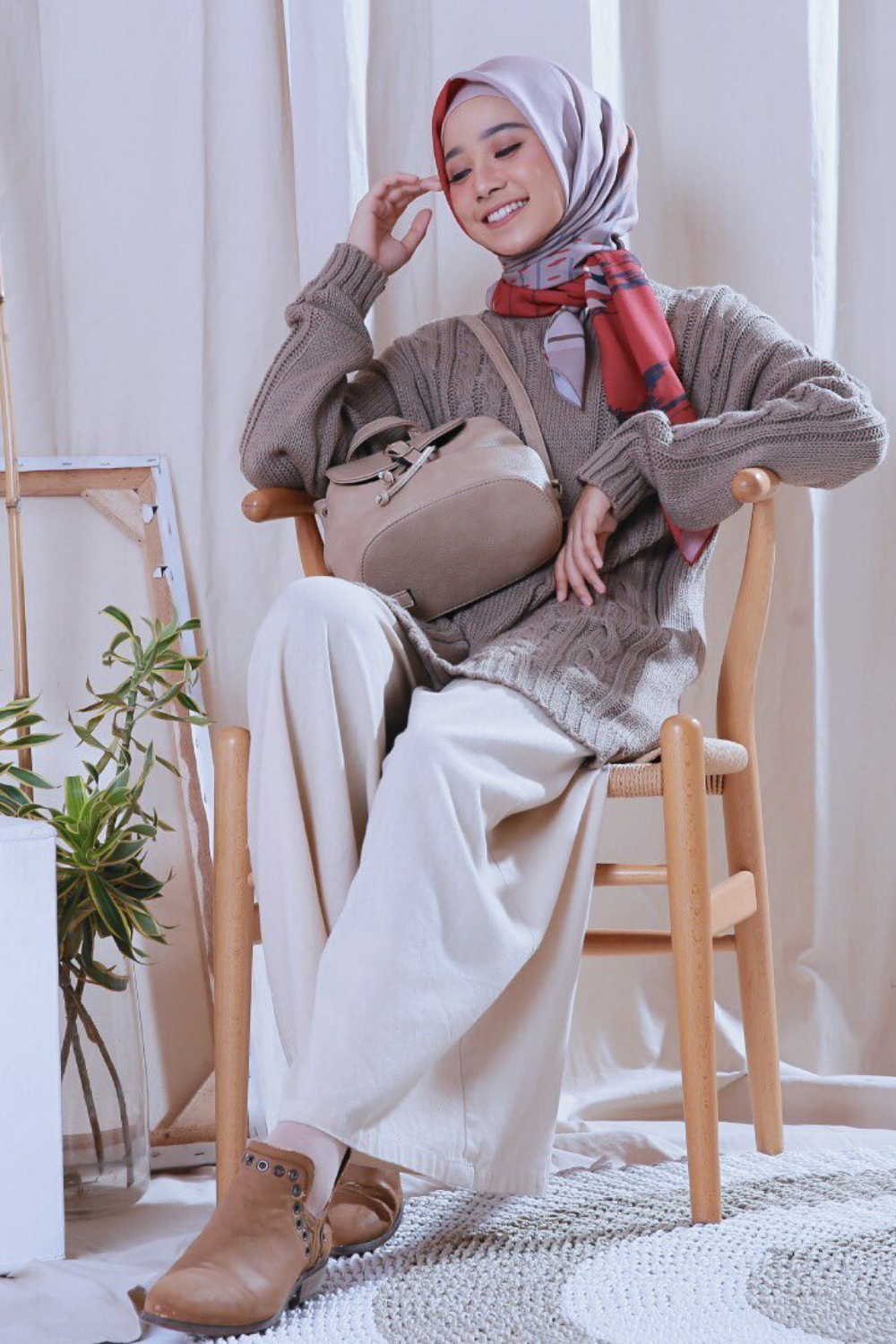 Salah satu outfit yang pas untuk menemani musim hujan adalah sweater rajut muslimah seperti ini. Cukup padukan dengan celana kulot senada dan hijab segiempat motif favoritmu.