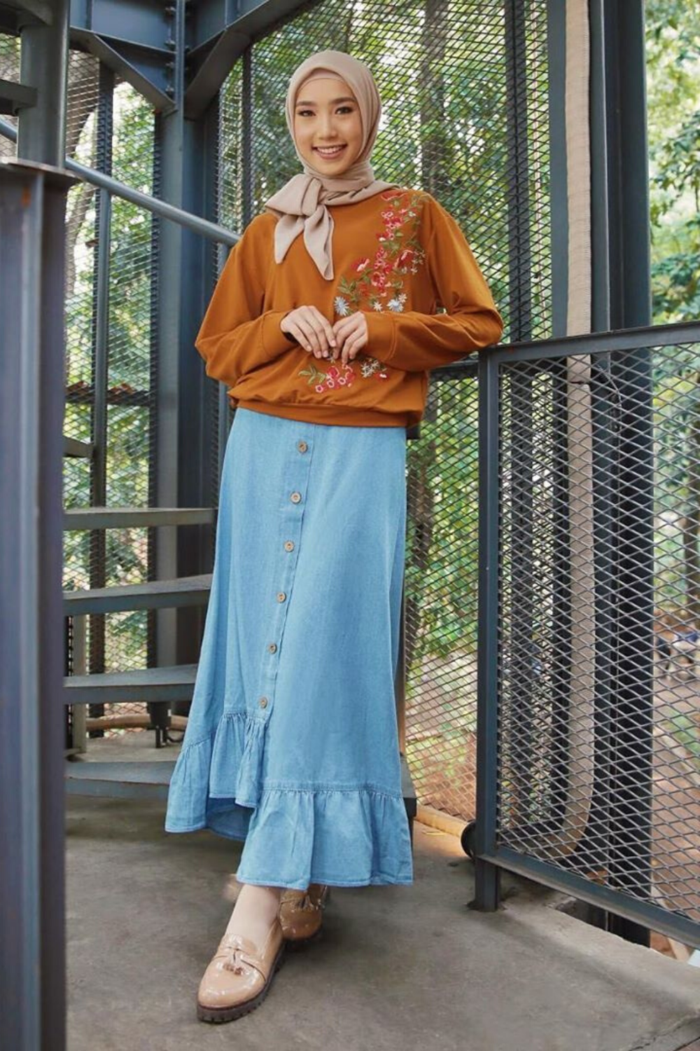 Jika kamu lebih suka tampil feminin, kamu bisa mencoba memasangkan sweater aksen bunga dengan rok panjang denim detail kancing depan. Untuk koleksi jilbabnya, gunakan hijab polos. Sempurnakan gaya ini dengan loafers favoritmu.