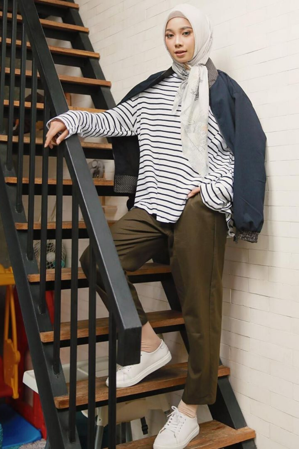 Tidak terlalu suka padanan gaya yang ribet? Simpel saja! Pasangkan kaos lengan panjang motif garis dengan jaket bomber, celana panjang polos, dan sneakers favoritmu. Untuk koleksi hijabnya, pilih jilbab segi empat dengan fitur waterproof.