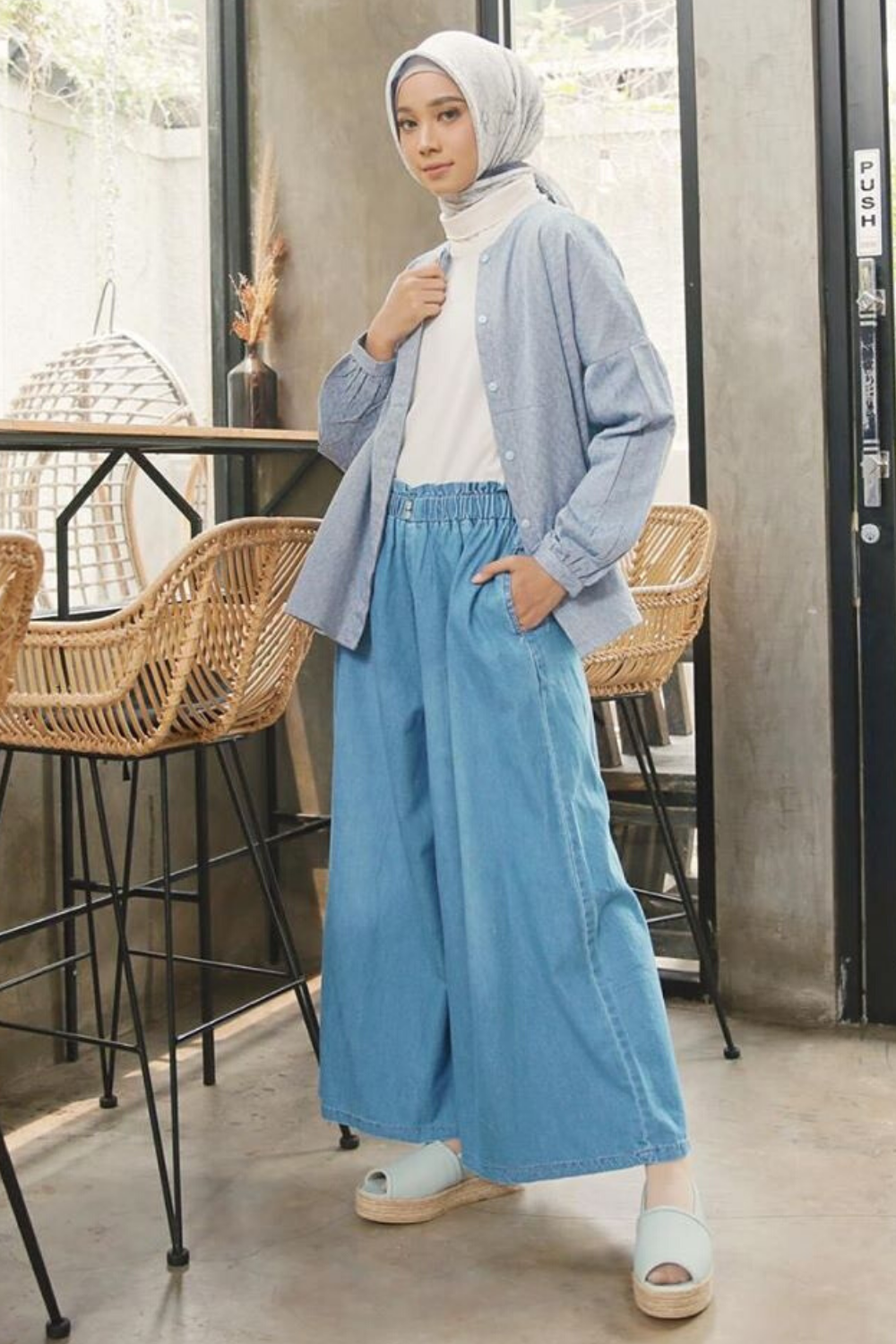 Untuk padanan gaya yang lebih ringan, kenakan celana kulot panjang jeans yang dipadukan dengan turtleneck top, outer, dan hijab segi empat polos berwarna senada. Kamu bisa menyempurnakan padanan gaya ini dengan menggunakan platform shoes.