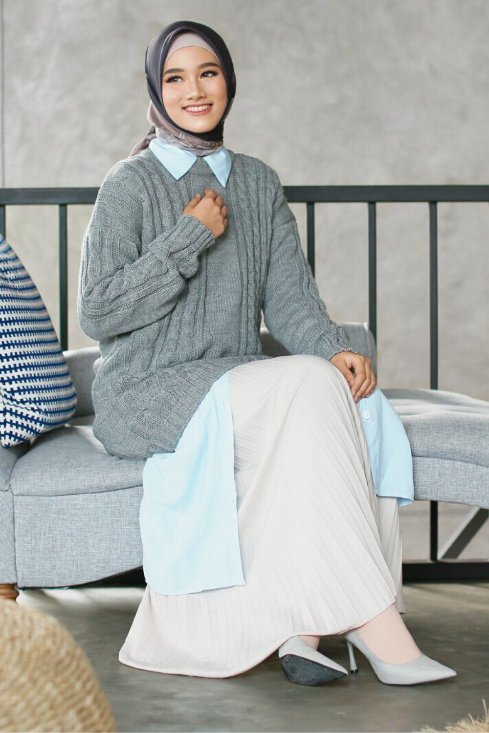 Untukmu yang tidak terlalu banyak beraktivitas di luar ruangan, bisa mengandalkan gaya yang satu ini. Kombinasi gaya tumpuk dengan pilihan rok plisket, sweater rajut polos, dan kemeja lengan panjang polos. Jangan lupa juga untuk mengenakan jilbab segiempat motif dengan styling yang simpel seperti ini.