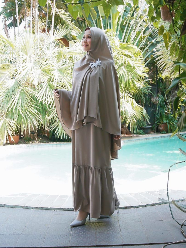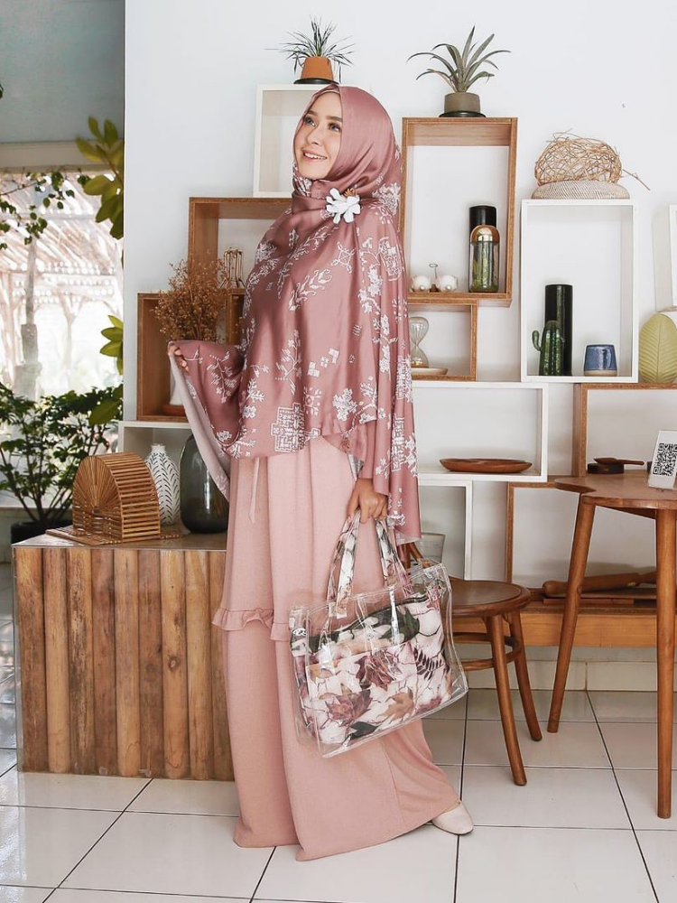 Gak perlu repot dan bingung dengan padanan gaya hijab syar’i yang manis. Cukup andalkan matching set seperti ini. Tambahkan bros juga untuk mempercantik tampilan.
