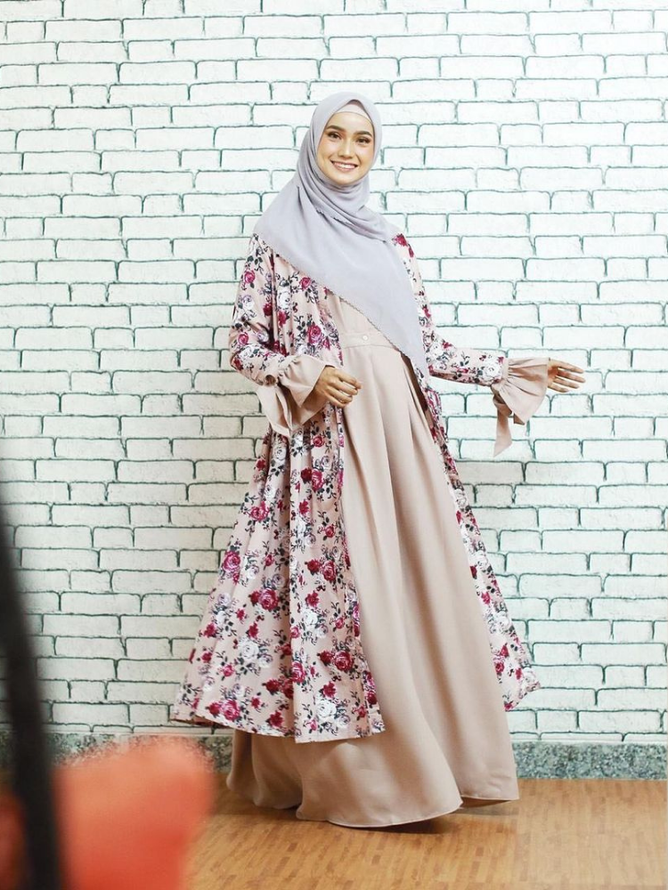 Untuk penampilan yang kasual, kamu bisa memadukan long dress polos yang dikombinasikan dengan long outer. Pilih hijab yang polos agar outer motif kamu terlihat kontras.