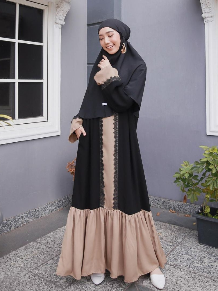 Saat model hijab bergo kian beragam dan cantik. Hijab yang satu ini memang praktis dan kini modelnya juga sudah banyak yang menutup bagian dada. Untuk padanannya kamu bisa memasangkan dengan gamis two-tone seperti ini.