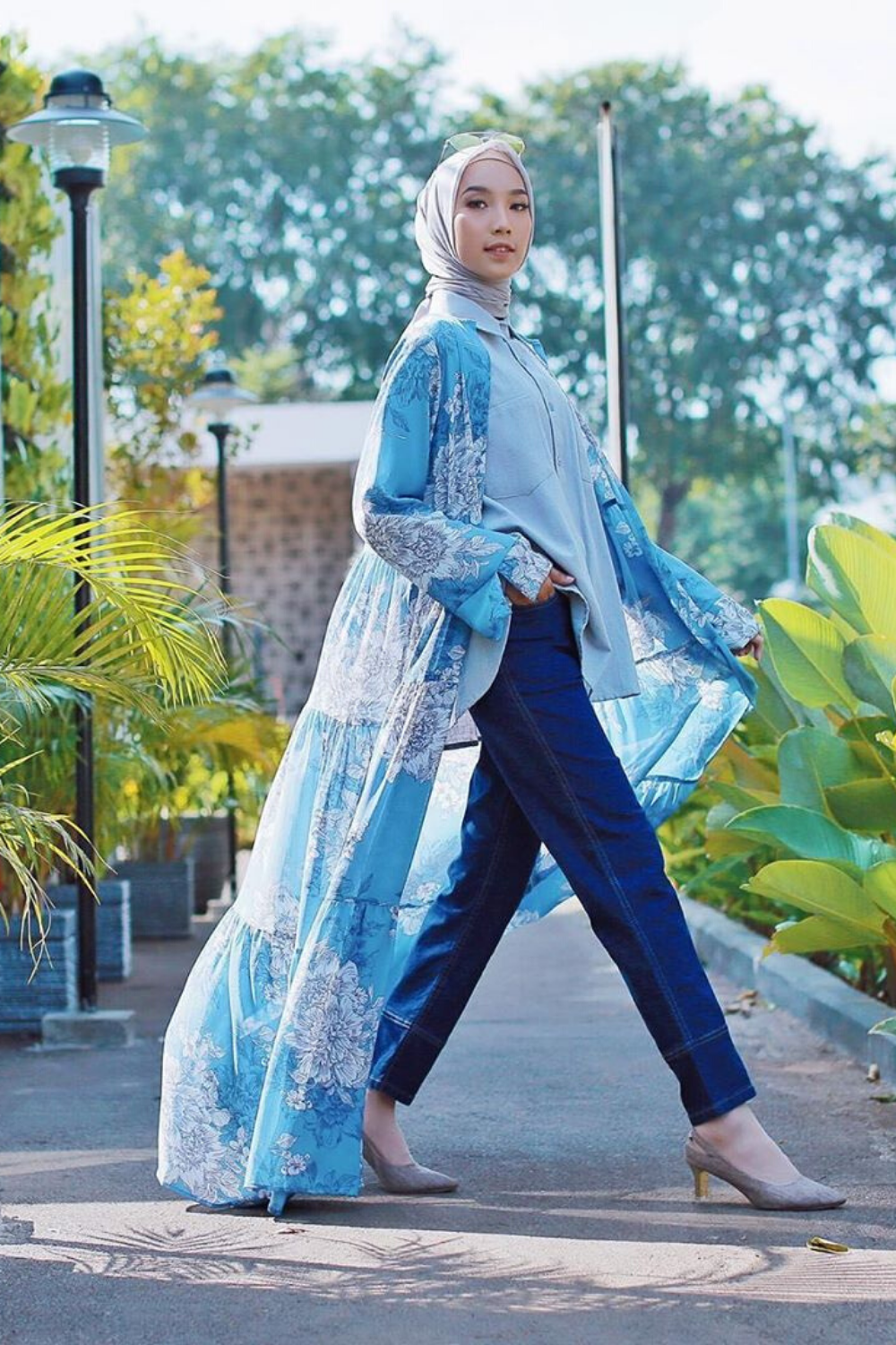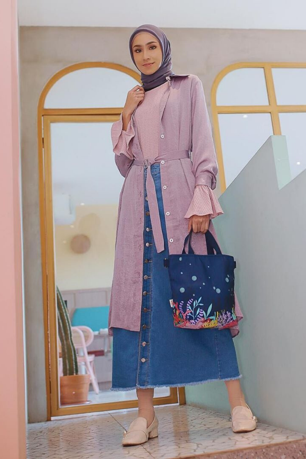 Berikutnya, ada padanan gaya yang simply chic. Jangan selalu menggunakan celana jeans sebagai pilihan, kamu juga bisa mencoba bereksplorasi dengan rok denim panjang. Padukan dengan basic tee dan long outerwear. Sempurnakan gaya ini dengan jilbab kontras dan loafers shoes.