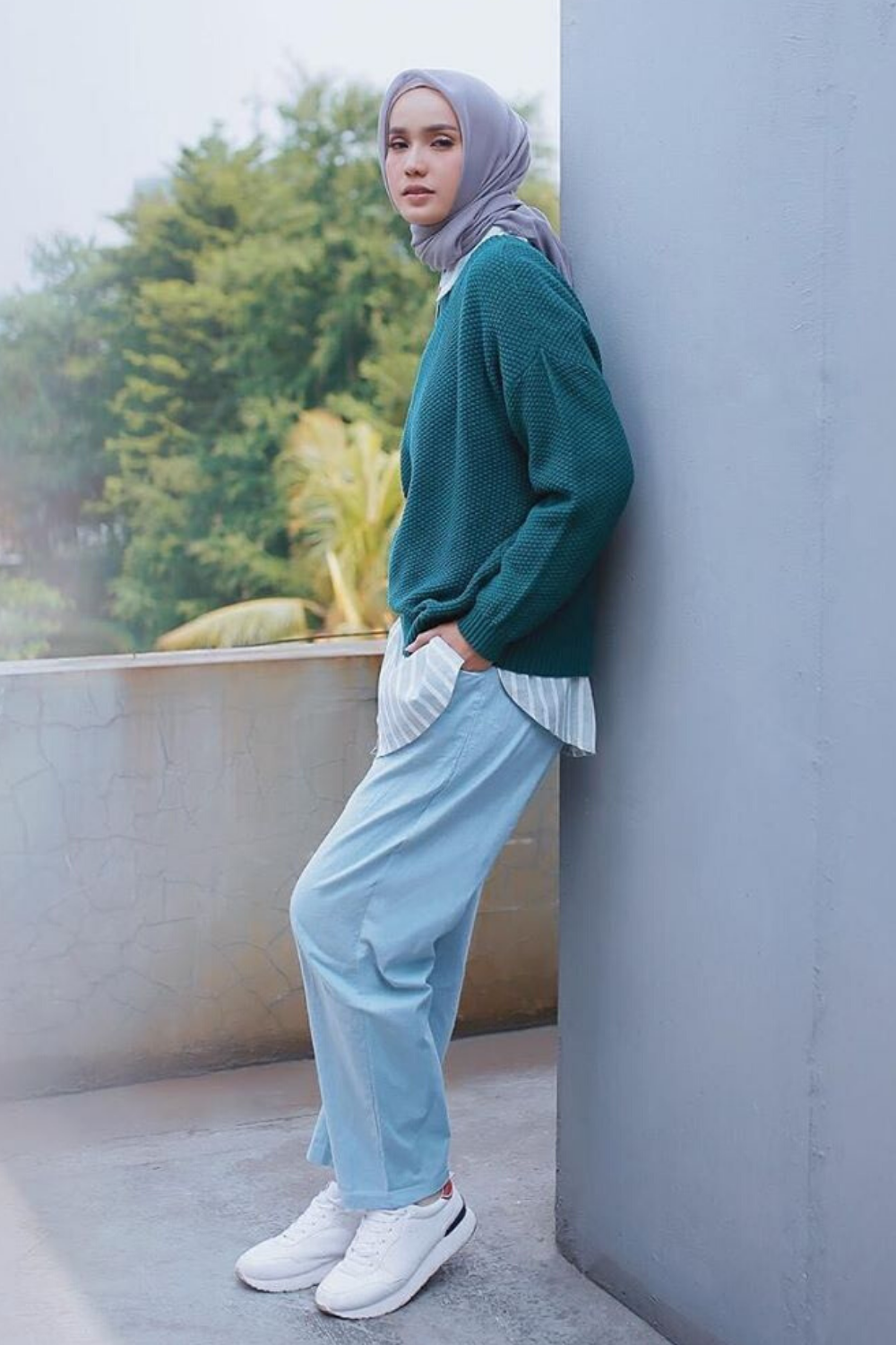 Butuh sedikit eksplorasi gaya? Pilih gaya preppy chic yang manis ini. Pasangkan kemeja lengan panjang motif garis dengan sweater dan wide-leg denim. Jangan lupa lengkapi gaya yang satu ini dengan jilbab kontras dan koleksi white sneakers. Gaya yang satu ini cocok untuk menemani musim hujan.
