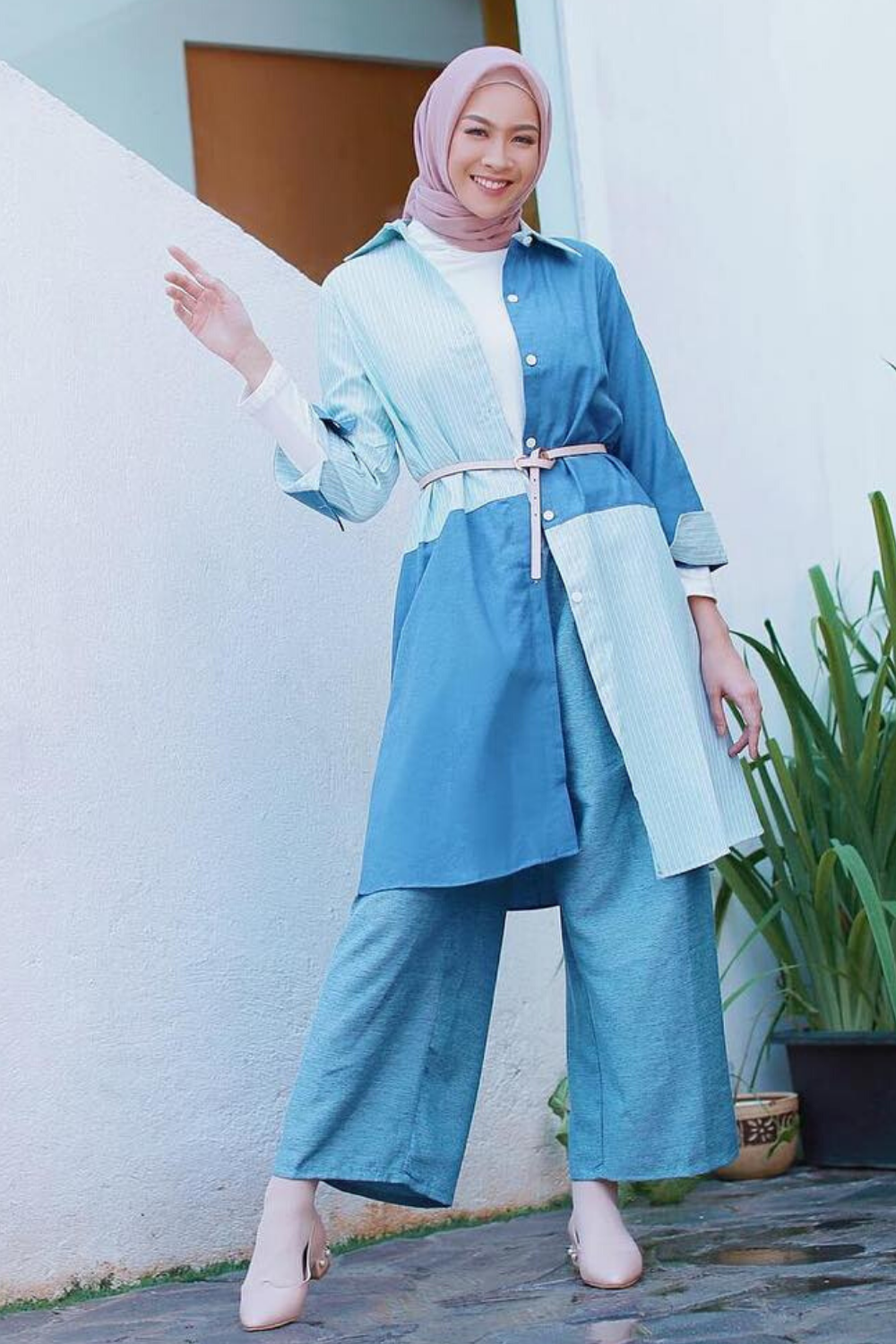 Salah satu trik gaya yang tak pernah gagal menghadirkan kesan instantly cool adalah denim on denim look. Yes! Cukup kombinasikan kemeja denim dengan celana kulot denim dan hijab kontras. Untuk memasukan kesan profesional, kenakan sepasang high heels sebagai finishing touch.