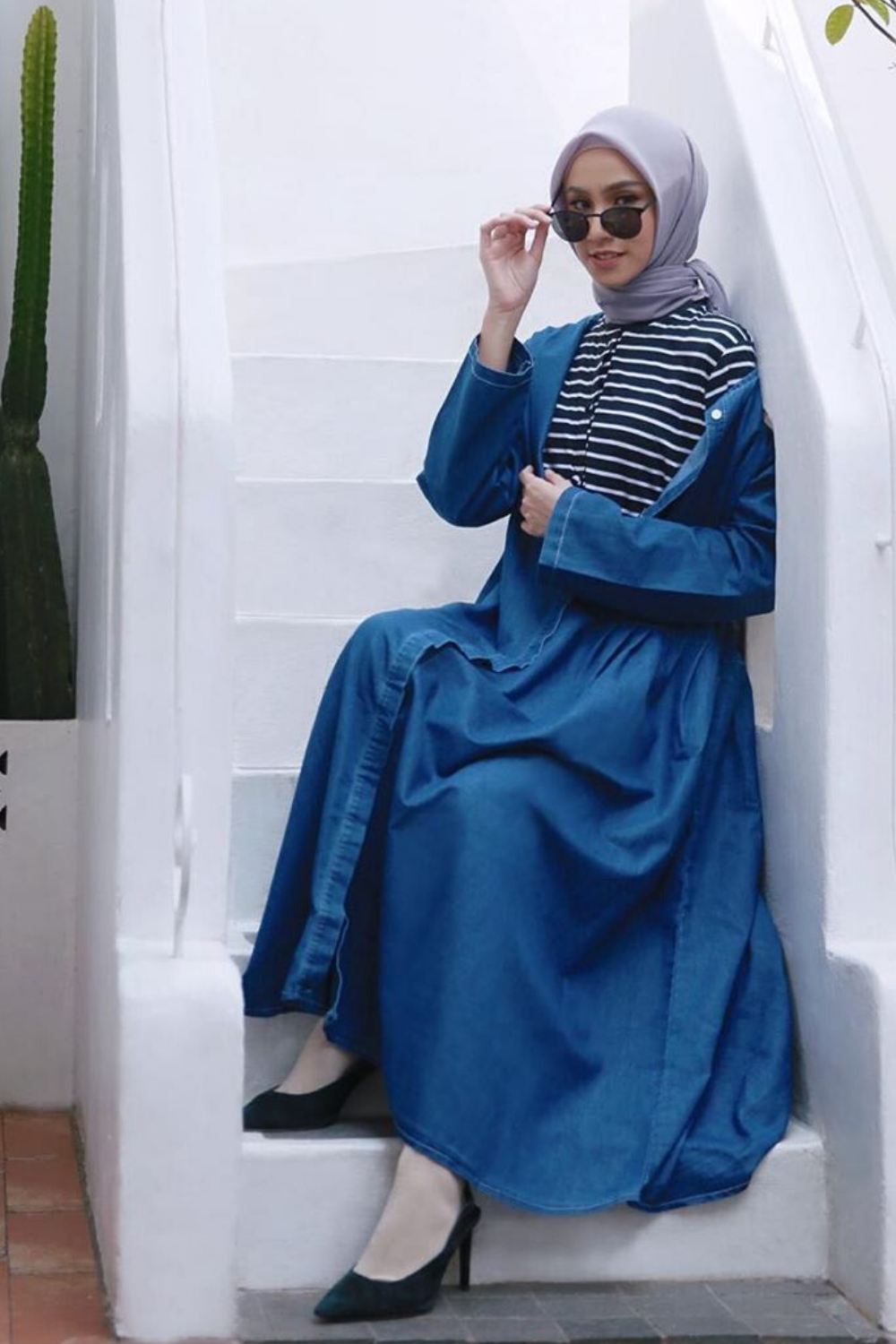 Terakhir, ada padanan gaya yang sempurna untuk pecinta feminine look.Gaya feminin lekat dengan penggunaan long dress. Nah, kamu bisa memilih menggunakan gamis jeans dengan model yang cantik seperti ini. Jika ingin sedikit bereksplorasi, kamu bisa menggunakannya bersama stripe top seperti ini. Buat tampilan yang satu ini kian jenjang dengan menggunakan koleksi heels favoritmu.