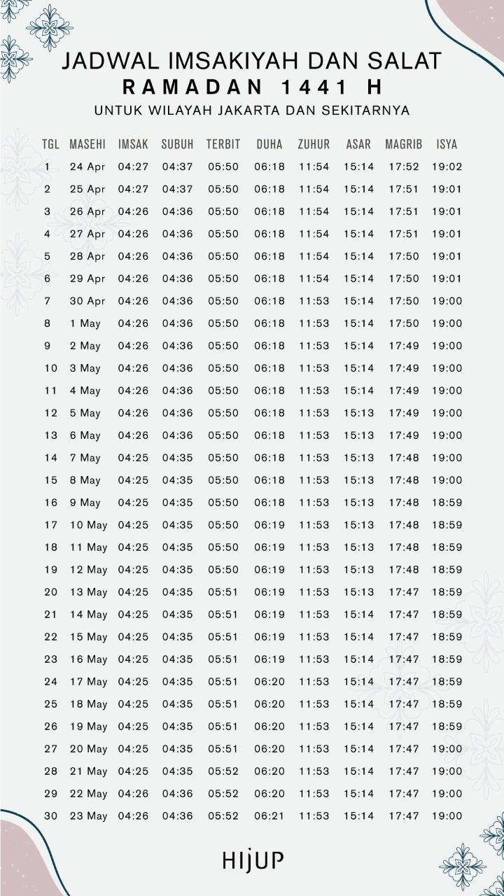 Jadwal Imsak Ramadan 2020/1441 H untuk Wilayah DKI Jakarta April 20, 2020 by HIJUP Marhaban ya Ramadan! Siapkan dirimu untuk lebih disiplin dalam beribadah di bulan Ramadan tahun ini. Untuk melengkapi jadwal ibadahmu, berikut jadwal imsakiyah 2020 untuk wilayah DKI Jakarta! SUMBER: BIMAS ISLAM, KEMENTERIAN AGAMA RI