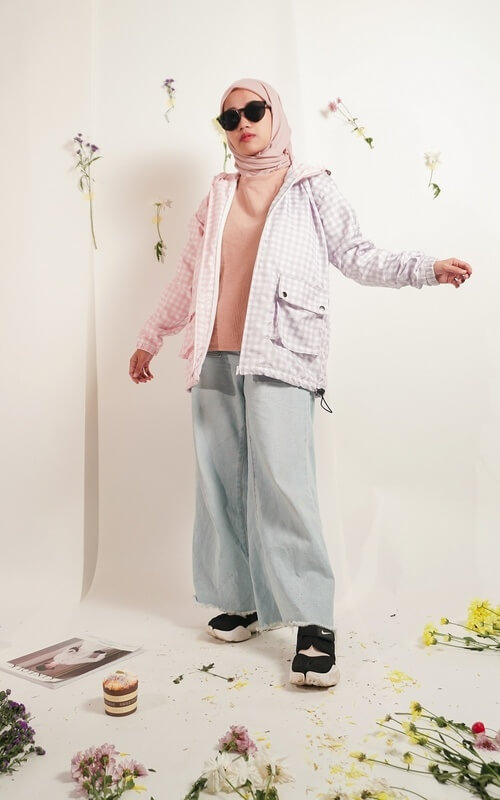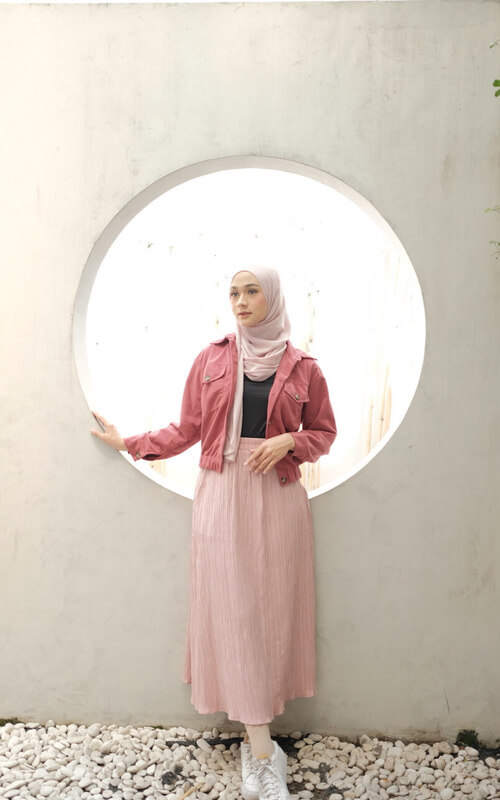 Kamu bisa pakai jaket ini sebagai outer lalu tambah inner kaos. Lengkapi dengan pashmina pink juga untuk membuat kesan feminim makin terasa. Agar tampak casual, kamu bisa padukan dengan sneakers.
