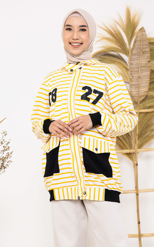 Kalau jaket untuk wanita yang satu ini bikin penampilan makin segar karena bernuansa cerah dalam balutan warna kuning, Dear. Motif garis-garis dan kombinasi warna hitam bikin jaket ini tampak lebih hidup dan terlihat stand out. Cocok nih menjadi jaket hangout buat kamu yang si ekstrovert.