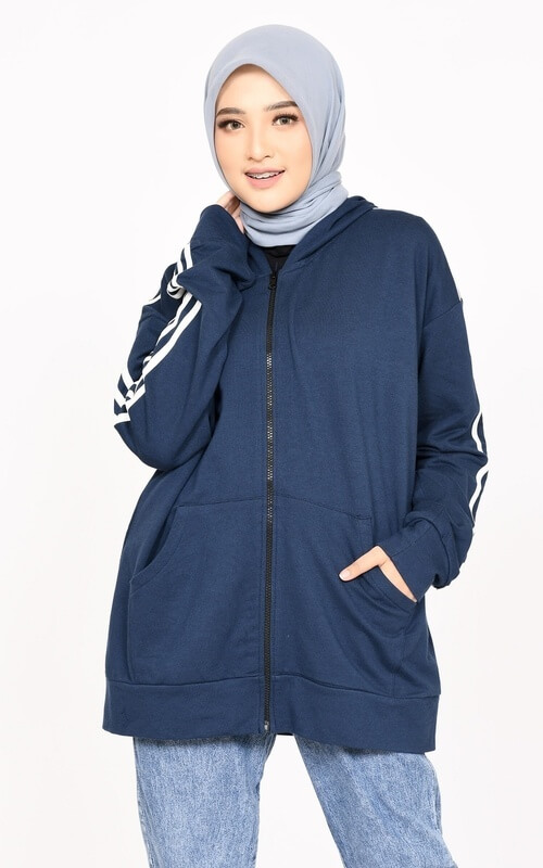 Pakai jaket dengan bahan tebal seperti ini bikin badan lebih hangat saat hangout di musim hujan. Modelnya juga longgar dengan potongan bawah yang panjang Dear, jadi lebih menutup aurat. Model zipper depan bikin jaket ini makin praktis digunakan.