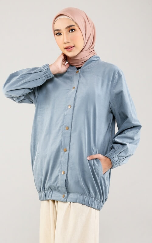 Jaket model ini identik dengan karet di bagian bawah badan dan ujung lengan. Warna biru bikin nuansa adem dan cocok untuk outfit tema vintage. Kamu bisa pakai juga sebagai outwear lho.