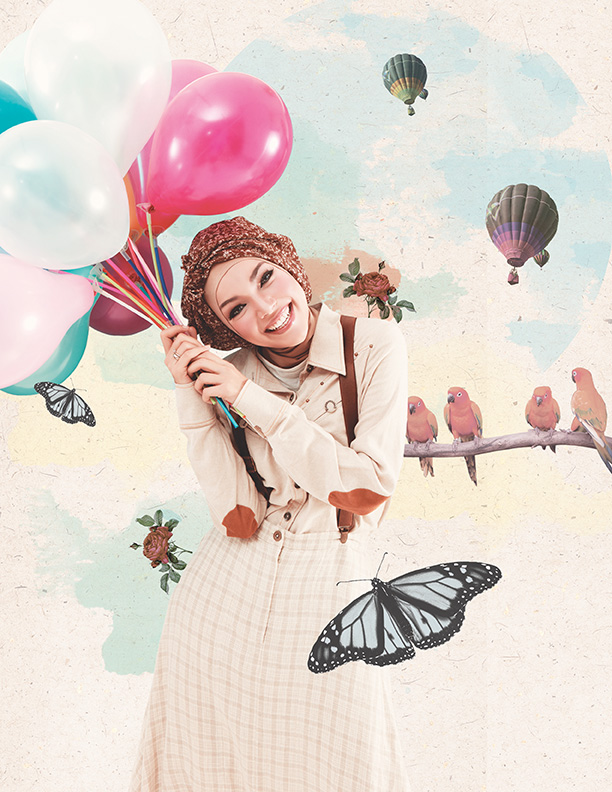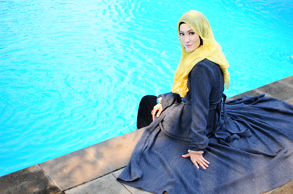 “Aku pakai hijab ketika masa kehamilan dan saat itu ada kejadian yang membuat aku yakin untuk pakai hijab. Ditambah suami, keluarga, teman-teman aku termasuk kakak aku dukung banget. Mungkin ada beberapa orang yang ketika awal memakai hijab tidak langsung seperti pakai topi, turban dan sebagainya tapi buat aku, aku langsung pakai hijab. Pemakaian hijab ini juga salah satu pilihan hidup yang besar buat aku. Pakai hijab juga kan bagian dari proses, at least I’m happy.”