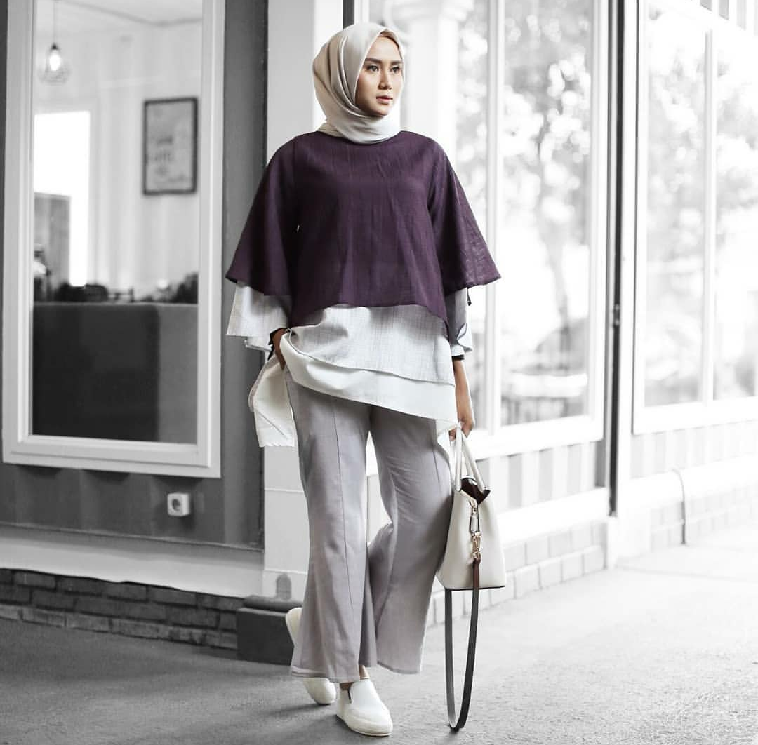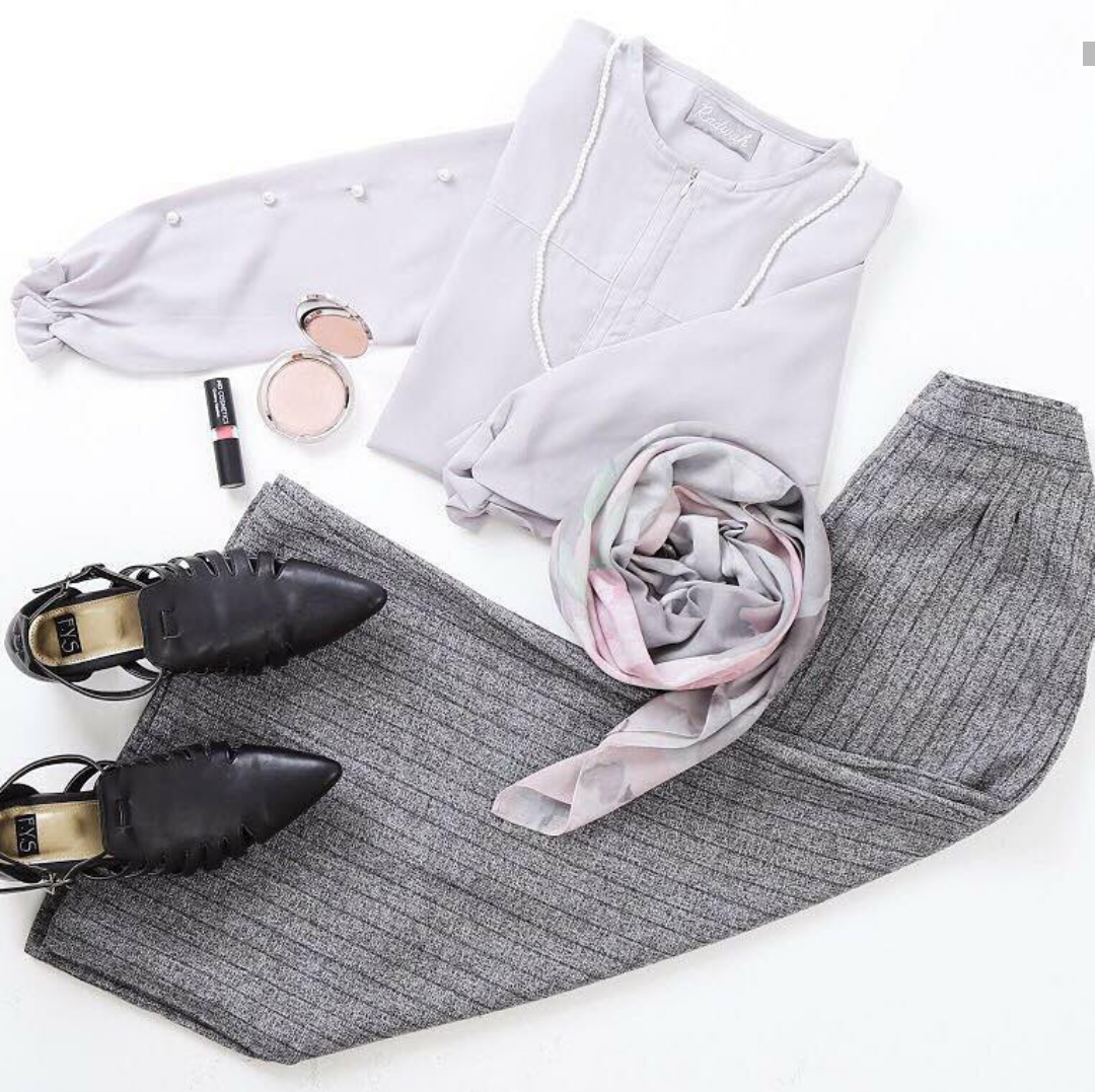 Bila kamu memiliki celana kulot berwarna abu-abu dengan motif garis vertikal, padukan dengan atasan seperti blus atau tunik dengan aksen pearl yang cantik. Selaraskan dengan jilbab motif abstrak bernuansa abu-abu. Padu padan ini cocok untukmu yang bertubuh mungil karena dapat memberikan efek tubuh yang ramping dan jenjang. Lengkapi tampilanmu dengan pointy toe shoes untuk menambah kesan penampilan menjadi lebih tinggi.