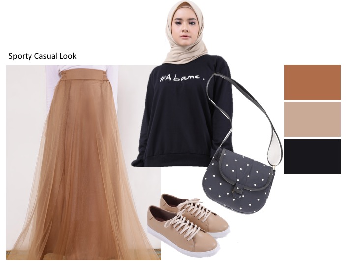 Siapa bilang dengan rok tutu kamu tak bisa tampil sporty? Pilihlah atasan berupa sweater dengan aksen typography yang simple. Kenakanlah dengan cara dimasukan ke dalam rok agar tampilanmu tak terlihat bulky. Untuk jilbab, pilihlah warna polos yang senada dengan rok tutu yang kamu kenakan. Tak lupa untuk menambahkan sneakers dan sling bag untuk membuat gaya sporty casual kamu semakin maksimal.