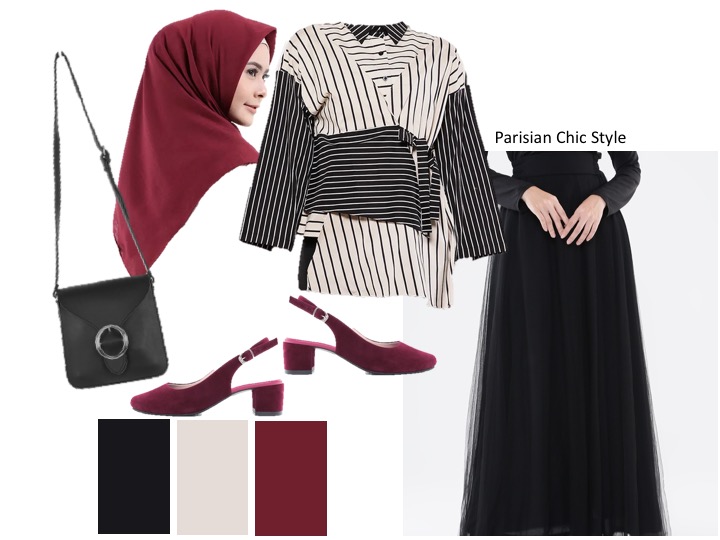 Rok tutu memang lekat dengan gaya feminin, namun agar tampilannya tak membosankan kamu bisa menjadikan gaya Parisian chic sebagai inspirasi. Atasan yang cocok untuk rok tutu kali ini adalah berupa kemeja garis-garis yang memiliki aksen menyerupai obi pada bagian pinggang. Aksen obi tersebut tak hanya membuat kesan stylish tapi juga bisa memberikan efek ramping pada penggunanya. Kamu bisa menggunakan atasan tersebut dengan cara dikeluarkan atau dibiarkan keluar menumpuk di atas rok. Untuk menghidupkan kesan Parisian chic, tambahkanlah statement warna pada sepatu serta jilbab dengan warna berbeda. Gaya yang khas dengan paduan warna hitam, putih, merah, dan aksen garis bisa kamu jadikan inspirasi gaya untuk semi formal.