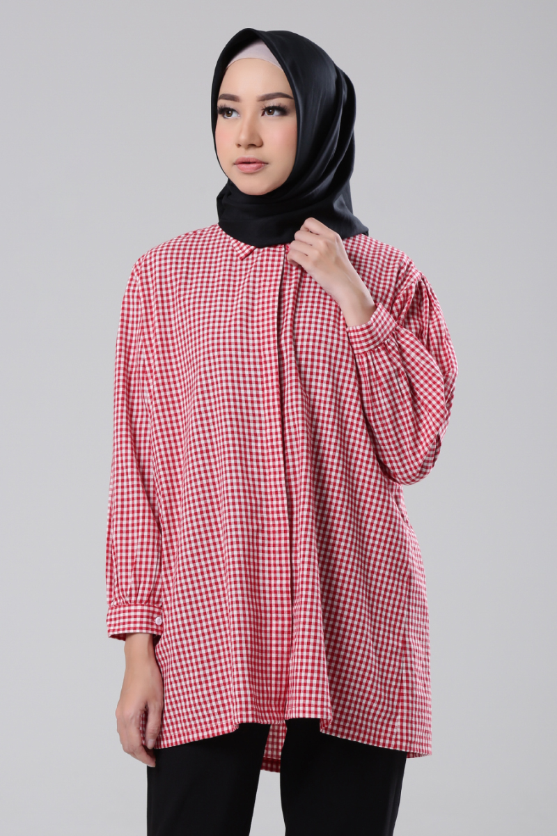 Motif gingham berwarna merah merupakan salah satu motif yang terkenal dan banyak diaplikasikan pada banyak fashion item, seperti atasan dan bawahan. Padukan dengan high waist pants dan high heels untuk tampilan yang fashionable dan sophisticated.