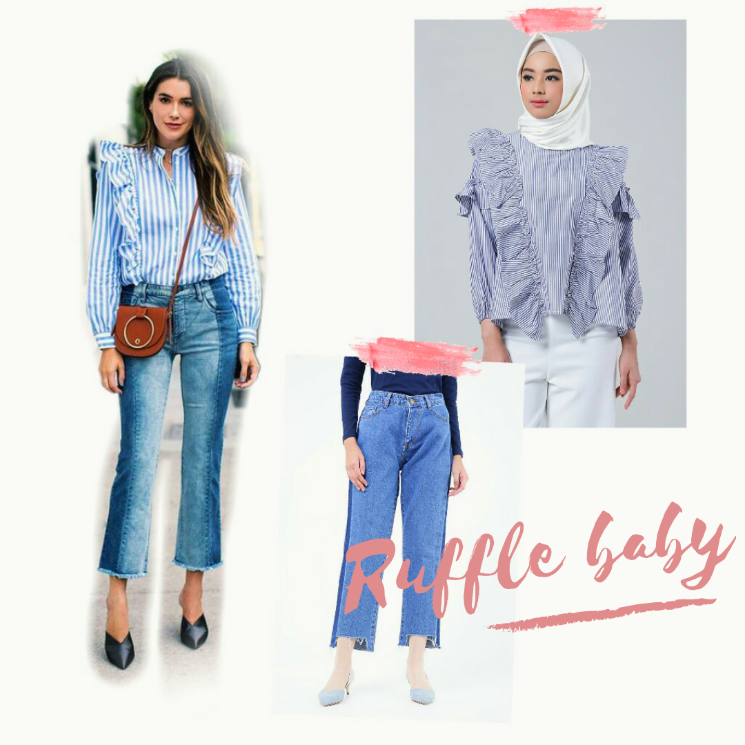 Butuh inspirasi untuk mix and match denim dengan hijab? Atas ruffle bermotif stripe dan side striped jeans merupakan pilihan yang tepat! Ruffle blouse yang memberikan kesan feminin dengan sentuhan victorian era, dipadukan dengan side stripe pants yang kekinian. Lengkapi tampilanmu dengan jilbab polos berwarna biru navy atau baby blue Pertegas tampilanmu dengan high heels dan hand bag berbahan kulit.