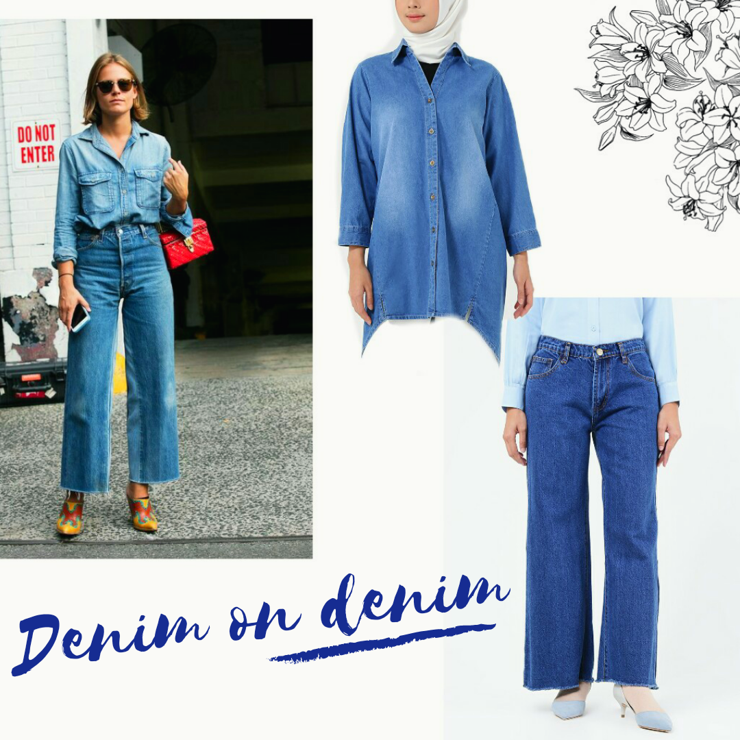 Denim on denim is always a good idea! Padu padan atasan denim dengan celana jeans memang suatu perpaduan yang tricky. Sebaiknya kamu tidak memadukan atasan dan bawahan yang memiliki ketebalan bahan atas warna yang sama. Kamu bisa memilih atasan denim dengan efek bleach atau bawahan ripped jeans atau raw finish.