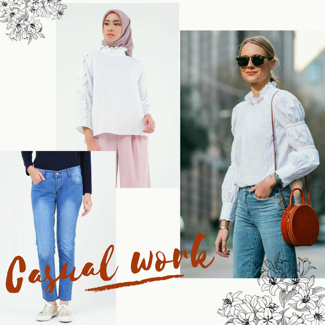 Masih dengan sentuhan ruffle, atasan putih beraksen ruffle yang dipadupadankan dengan dark wash jeans bisa menjadi alternatif untukmu yang bosan dengan kemeja putih biasa. Lengkapi dengan jilbab bermotif flowery kecil yang membuatmu semakin stylish.