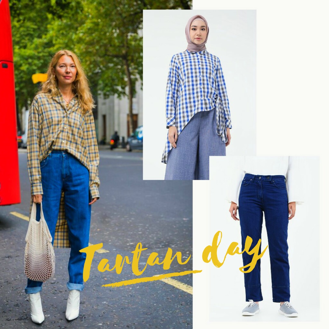 Terinpirasi dari pattern yang lahir pada abad ke-16 di Skotlandia, Tartan atau 70s plaid kini kembali menjadi tren di tahun 2018. Bila dulu umumnya terbuat dari bahan flanel bermodel kemeja, kini motif ini berkembang dengan berbagai bahan dan model pakaian. Untuk tampilan yang stylish ke kantor atau acara casual lainnya, kamu bisa memadupadankan tunik bermotif tartan dengan mom jeans yang semakin melengkapi tampilan vintage-mu. Mom jeans adalah celana dengan jahitan tinggi hingga perut yang terbuat dari denim dan memiliki kantong saku belakang yang tinggi.