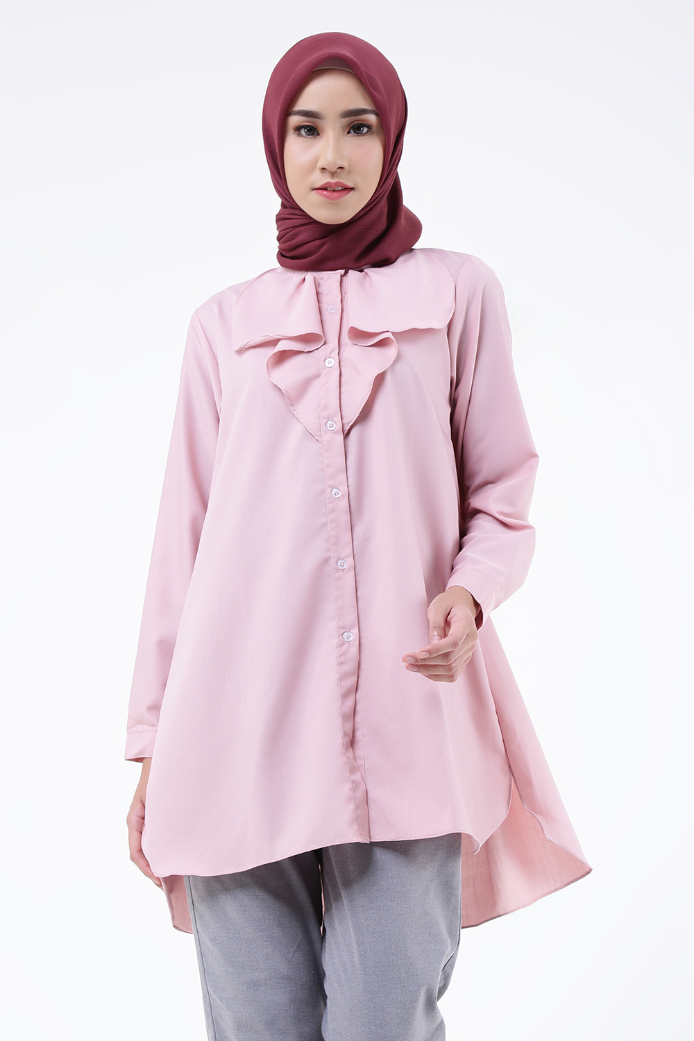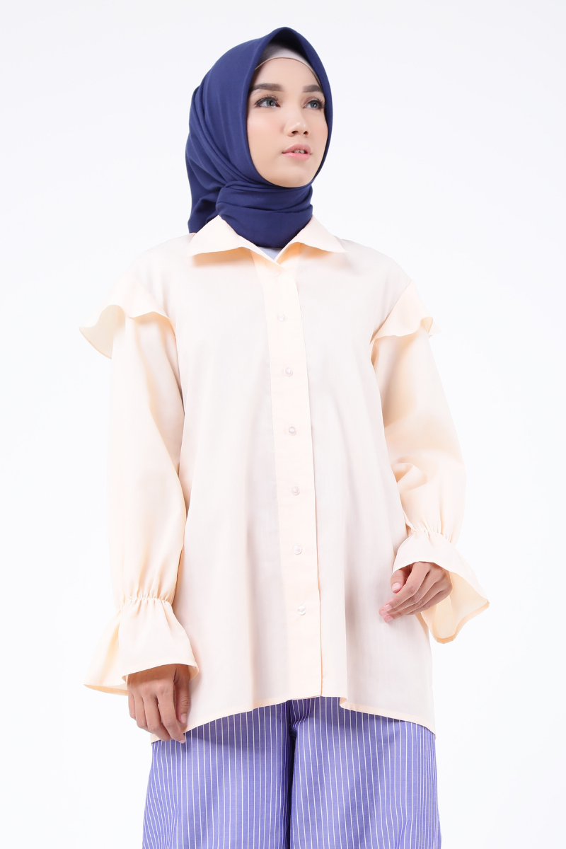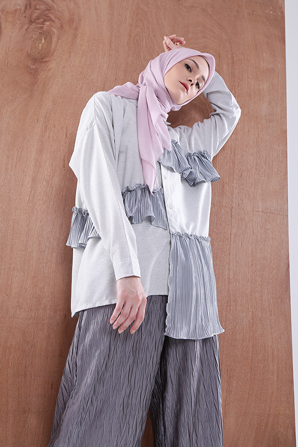 On trend: padu padan kemejaoversize dengan aksen ruffle dan celana pleats.