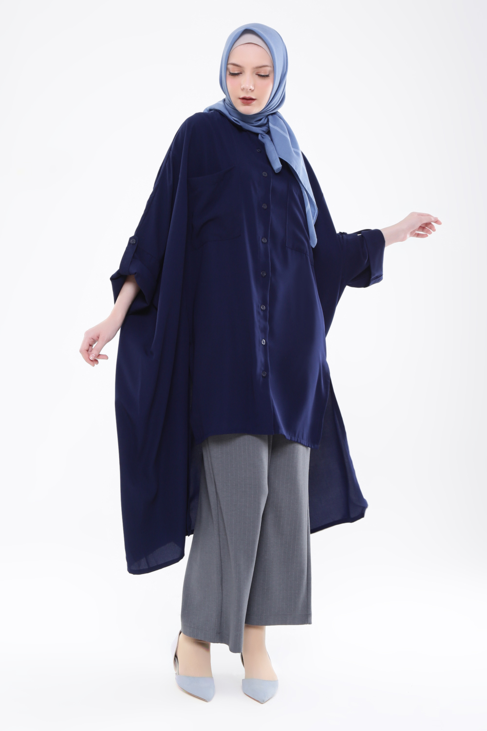 Padukan baju oversized berwarna navy dengan jilbab dan celana berwarna putih.