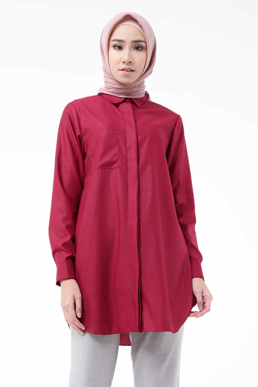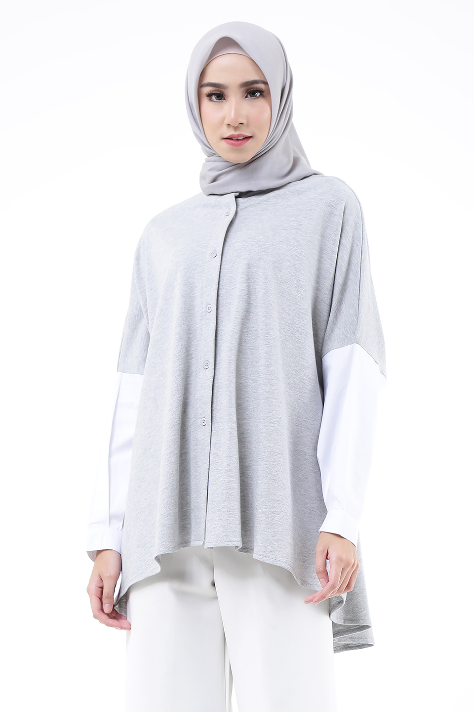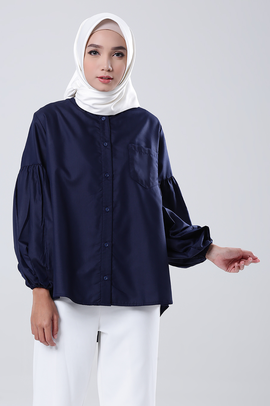 Baju oversize berpotongan A dengan bentuk kerah yang tidak biasa sebagai statement blouse.