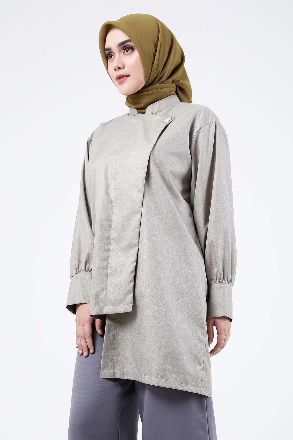 Model baju oversize asimetris yang dipadukan dengan wide leg pants untuk tampilan ke kantor yang santai.