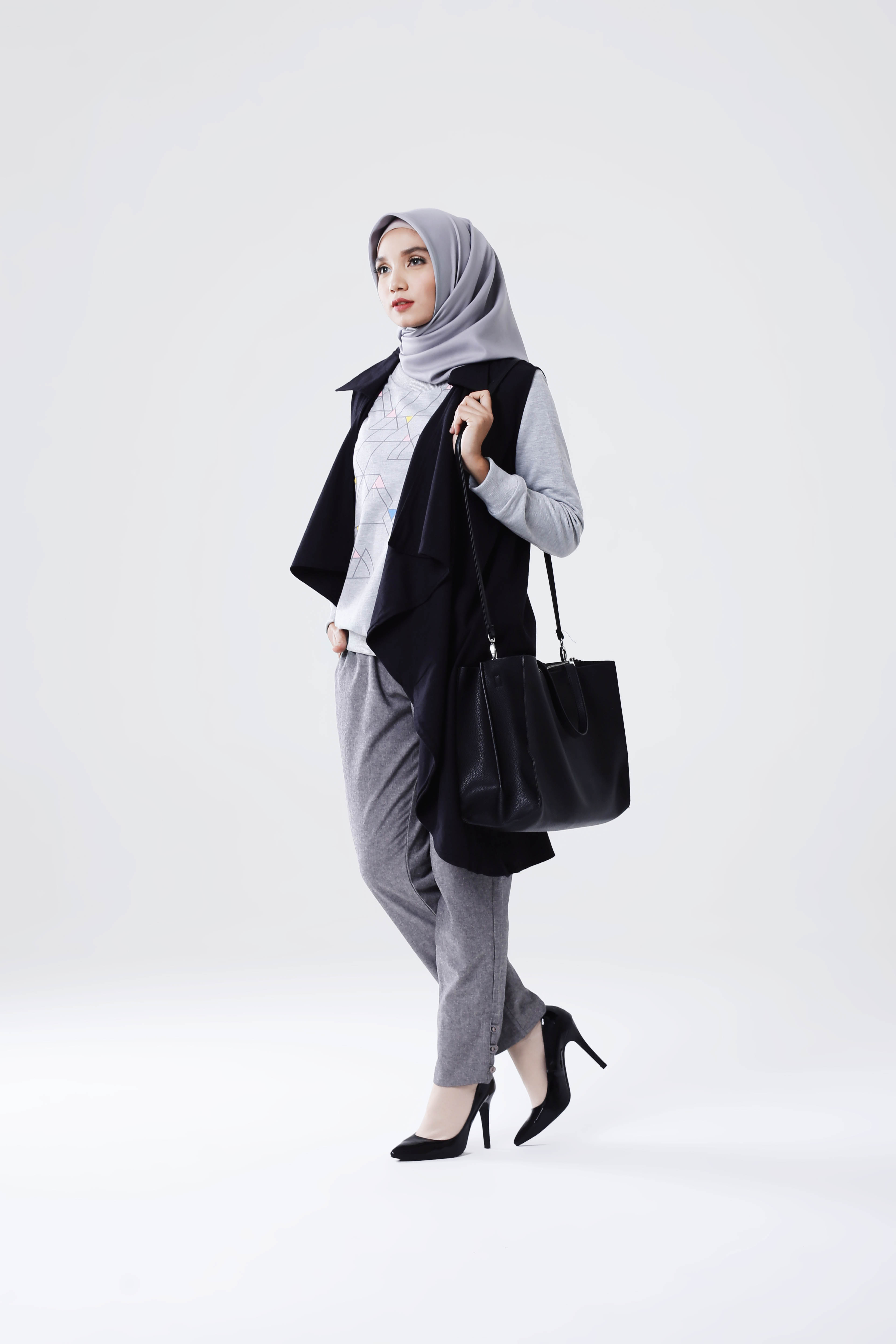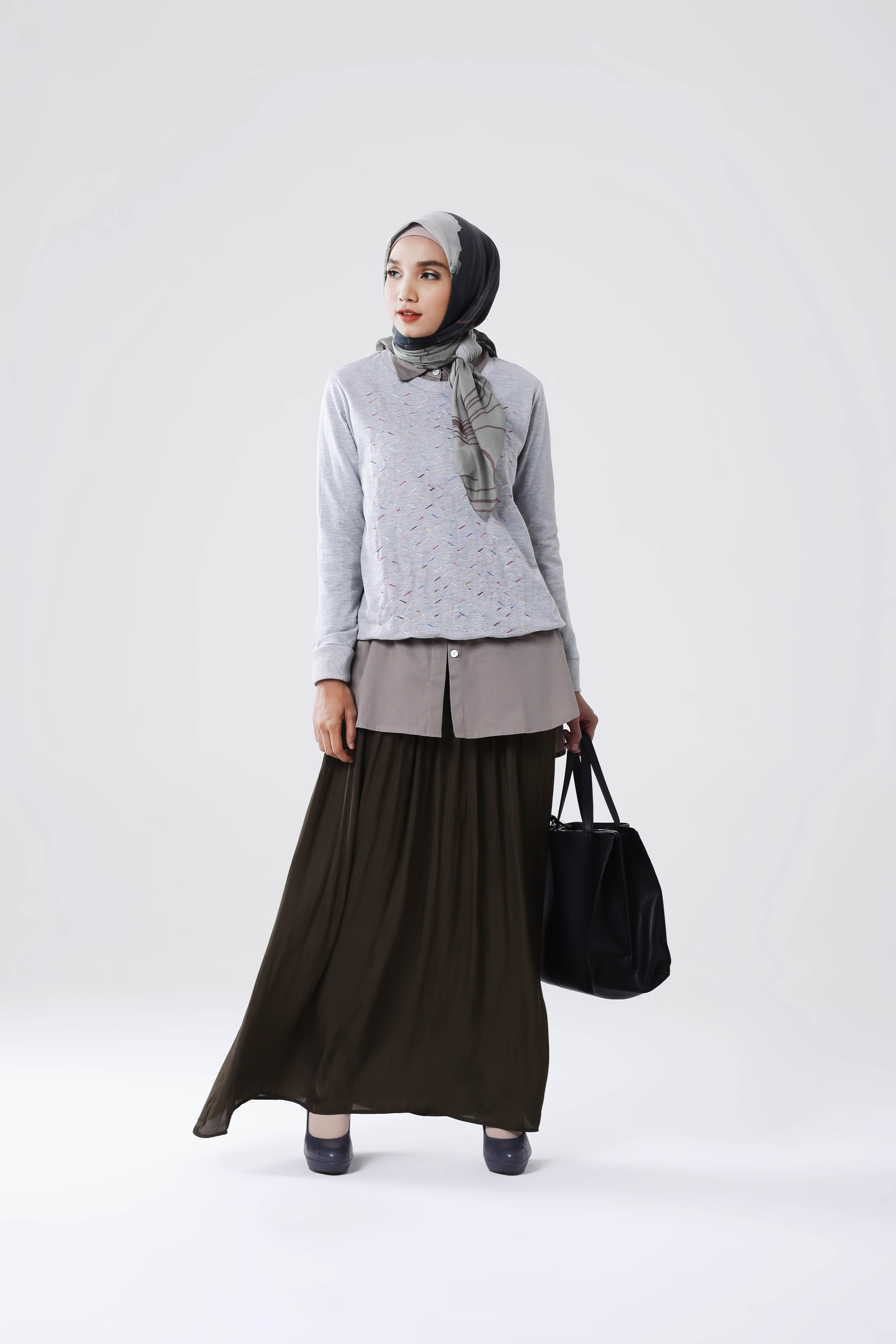 Perpaduan sweater, kemeja, dan maxi skirt sangat cocok untuk menunjukkan gaya *preppy *pada tampilanmu. Pemilihan warna seperti olive dan grey memberikan kesan hangat dan lembut. Kamu bisa mengandalkan outfit ini saat hari yang padat dengan meeting untuk memberikan mood yang tenang. Padukan dengan tote bag dan high heels agar nuansa formal juga tetap terasa. Jika sweater-mu polos, kamu bisa memilih hijab bermotif abstrak atau floral agar terlihat lebih catchy.