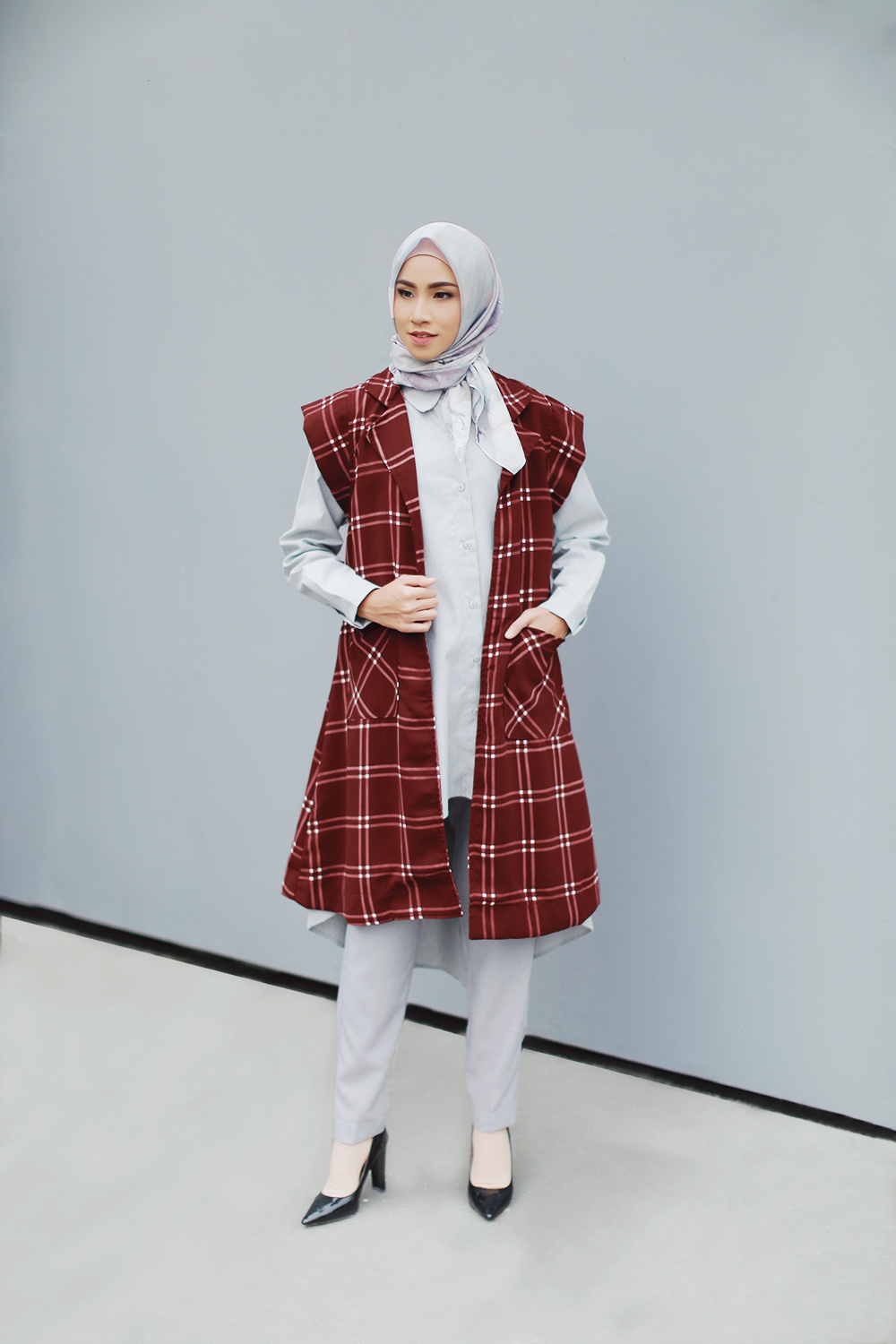 Bagi para wanita karir yang bosan dengan kemeja sehari-hari, kamu bisa menggantinya dengan tunik. Beri sentuhan semi formal dengan memadukan tunik bersama celana serta jilbab berwarna senada serta statement outer seperti vest dengan warna merah. Sempurnakan tunik ke kantor dengan high heels berwarna hitam.