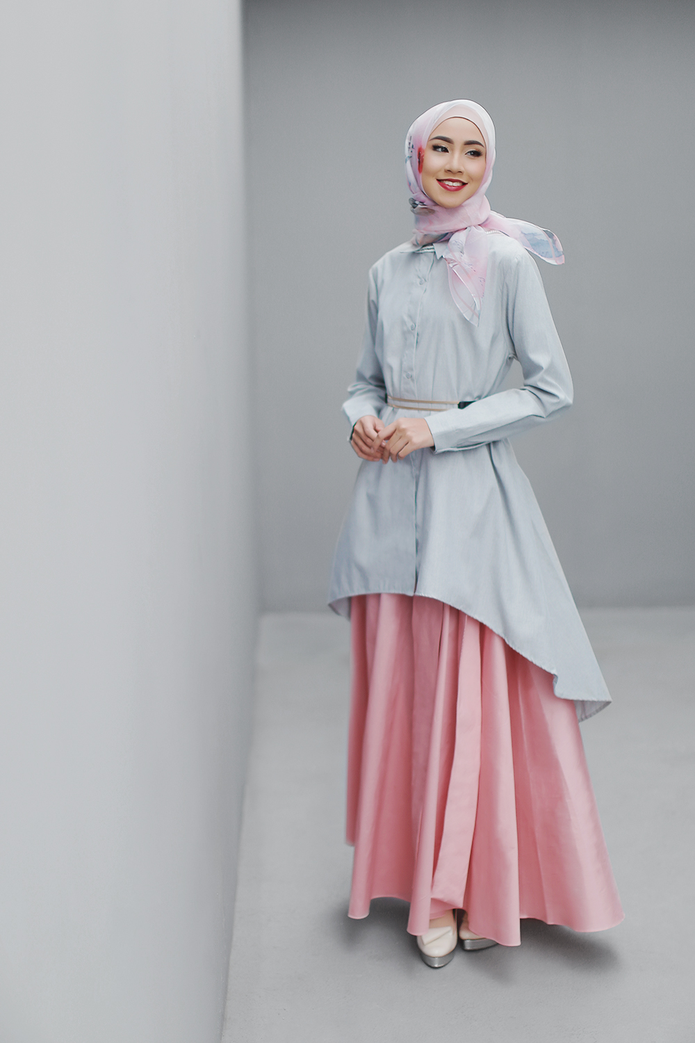 Siapa bilang tunik tak bisa kamu jadikan teman untuk ke pesta. Dengan padu padan yang benar kamu bisa menjadikan tunik sebagai atasan yang elegan. Tambahkan belt bernuasa gold yang juga akan memberikan siluet ramping. Padukan dengan A-line skirt berwarna pink serta jilbab organza motif yang memiliki paduan warna abu-abu dan pink.