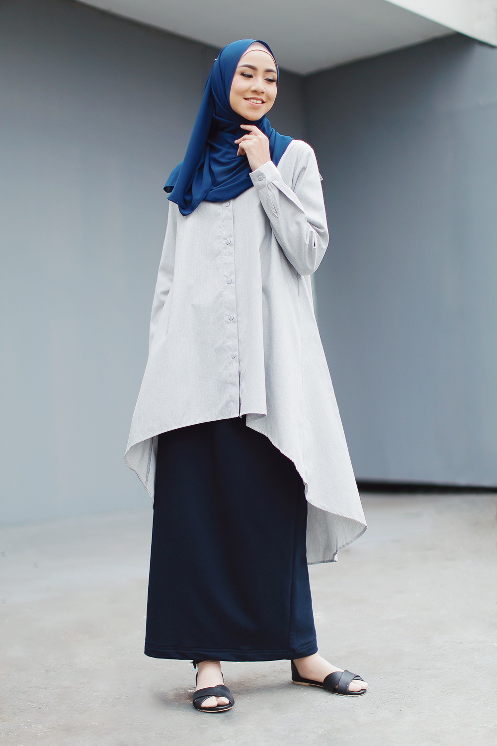 Untuk gaya sehari-hari yang santai, kamu bisa padukan atasan tunik berpotongan loose dengan bawakan berupa pencil skirt. Pilihlah paduan warna navy pada rok serta biru lebih muda pda jilbab. Buat gayamu nyaman dengan mengenakan sandal flat bernuansa hitam.
