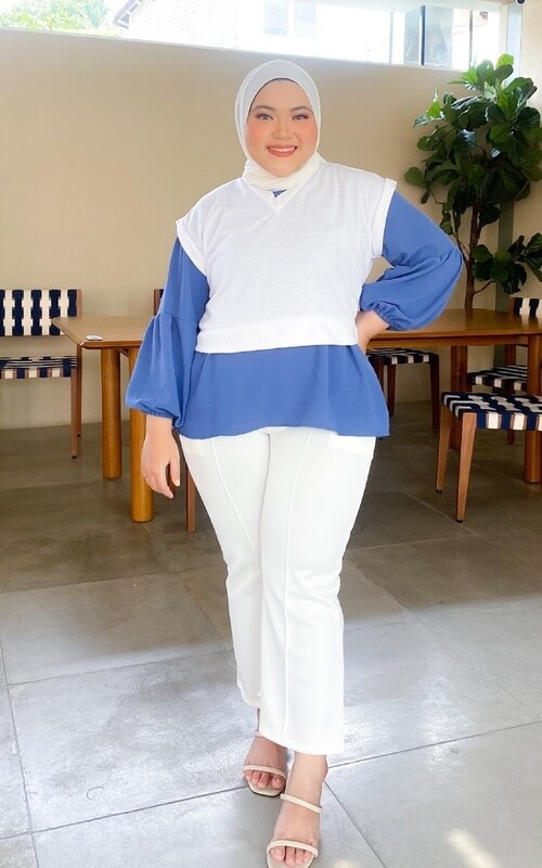 Warna biru dipadu dengan putih bikin atasan ini jadi modis ya, apalagi bentuknya yang terlihat seperti pakai vest. Agar terkesan simpel tapi tetap eye catching, kamu bisa coba mix baju atasan ini dengan celana dan hijab berwarna putih, lalu lengkapi dengan strap heels warna putih juga untuk memberi kesan girly!