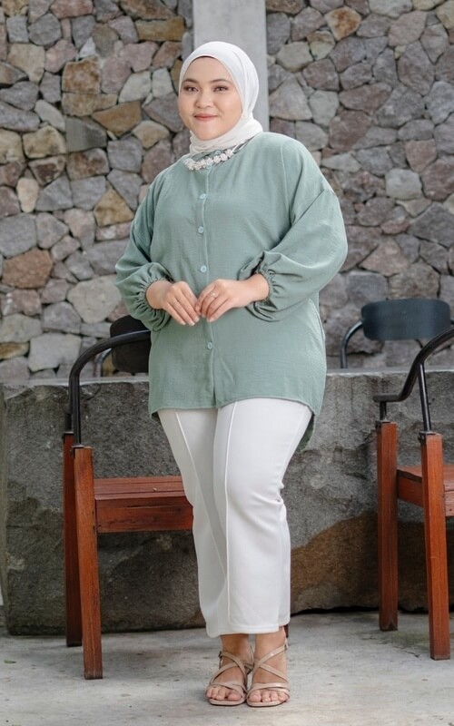 Kalau kamu suka gaya busana yang simpel tapi tetap terkesan fashionable, maka bisa pilih baju atasan dengan nuansa hijau tanpa motif seperti foto di atas. Warna hijau yang seperti ini sedang viral lho, dan konon paling cantik kalau dipadukan dengan item fashion lain yang warnanya putih.
