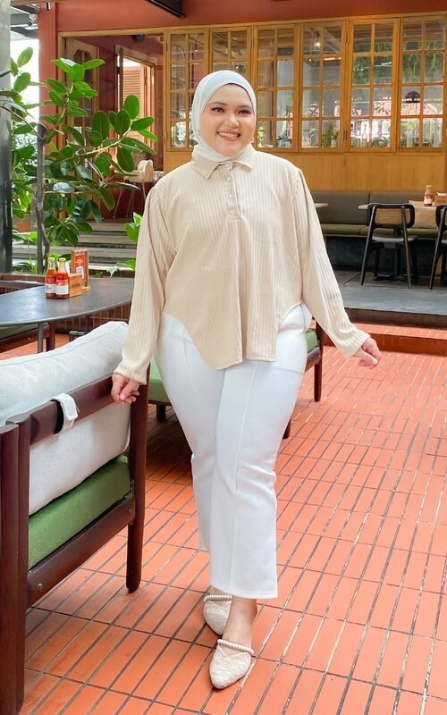 Pakai kerah dan kancing depan bikin atasan ini cocok untuk pecinta style hijab diikat ke belakang, jadi kamu nggak harus tambah manset leher. Tak perlu ribet, padukan saja dengan celana dan pashmina putih yang super netral. Makin unik jika kamu pakai flat shoes dengan strap berbahan mutiara putih.