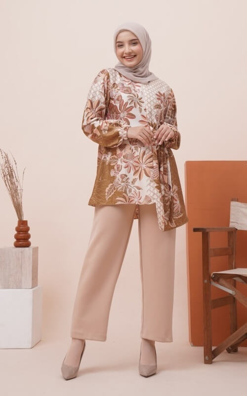 Ujung lengan yang berkaret membuat batik ini cocok untuk bepergian karena wudhu friendly. Karena warna dominan dari batik ini adalah coklat, maka kamu bisa padukan dengan celana dan hijab yang warnanya lebih terang agar nggak terlihat too much. Supaya makin feminim, jangan lupa kenakan heels ya Dear.