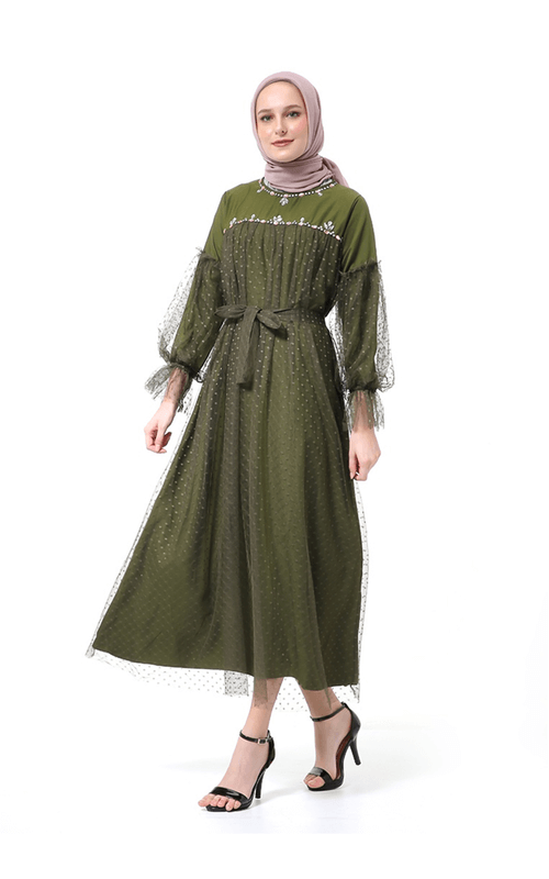 Adanya tambahan manik-manik pada bagian atas gamis juga akan membuat penampilanmu semakin menarik. Kamu bisa menempatkan pita pada bagian depan gamis brokat untuk memberikan kesan yang elegan.
