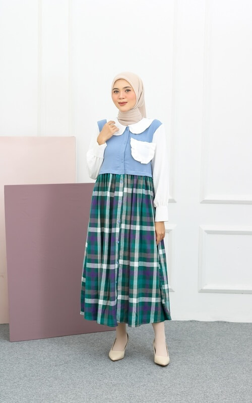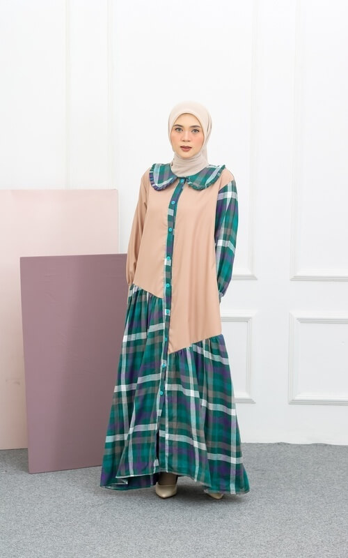 Kesan young and casual bisa kamu buat dengan memakai gamis bernuansa hijau biru ini, Dear. Mirip seperti model sebelumnya, gamis ini juga memadukan motif kotak dengan kain polos tapi pada sisi atas dan bawah. Bentuk kerah melengkung dan pocket pada dada bikin tampilannya makin menggemaskan ya!