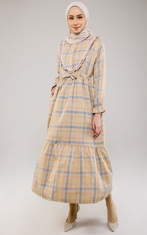 Jika ingin tampilan simpel sekaligus kalem, maka gamis warna soft cocok jadi pilihan. Dibanding sebelumnya, gamis nomor dua ini punya motif kotak dengan ukuran lebih besar dan memadukan tiga warna.