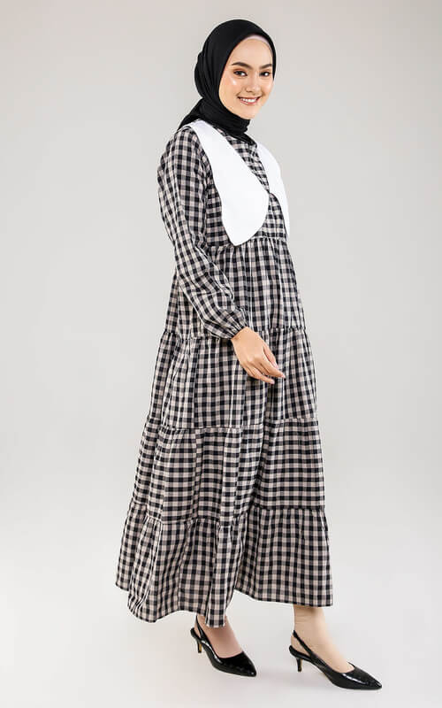 Sama-sama berwarna kalem, tapi kali ini motif kotak pada gamis hanya ada di satu sisi yatu sebelah kanan. Sementara sisi kiri menggunakan kain polos warna hitam tapi dengan lengan bermotif kotak.