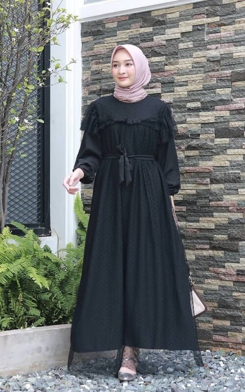 Bagian pundak tampak ramai dengan model tumpuk, dan ada aksen tali di perut yang bikin tubuh terlihat slim. Sementara di bagian bawah, model roknya berpotongan A-line sehingga kaki bisa melangkah dengan nyaman. Tak harus dengan hitam juga, kamu bisa padukan dengan hijab dan sandal warna lain.