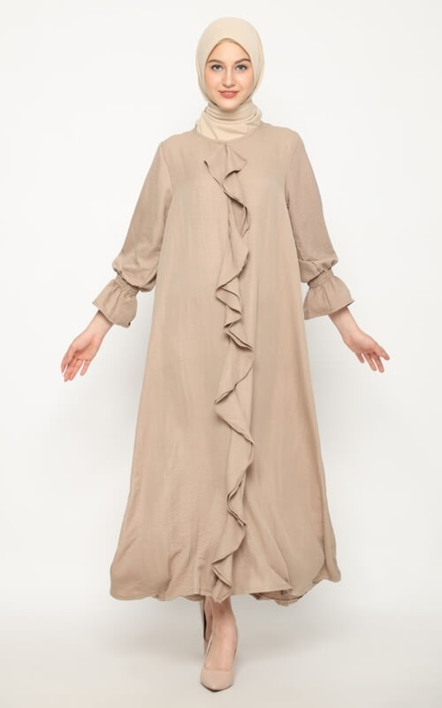 Kalau ini, gamis netral dengan aksen ruffle yang belakangan ini sedang hits. Aksen ruffle sendiri adalah kain yang dijahit sedemikian rupa agar jadi kerutan di satu sisi, dan sisi lainnya tetap dibuat terbuka / lepas. Aksen ini memang banyak diaplikasikan pada item fashion yang tanpa motif agar tidak terkesan polos.